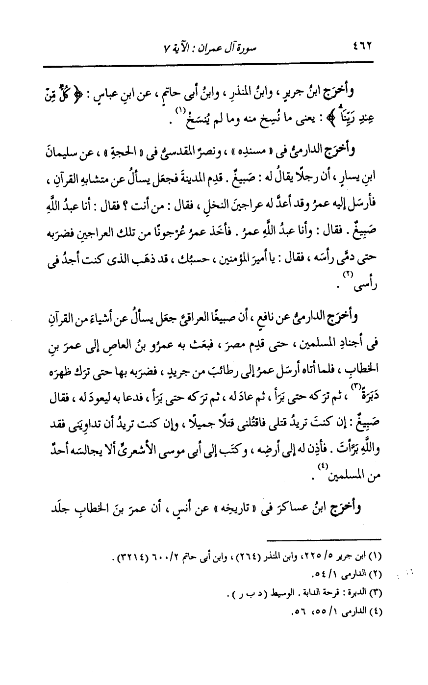 وَأخرَج ابن جرير عن ابن عباس قال : قال رسول الله صلى الله عليه وسلم : أنزل القرآن على سبعة أحرف : حلال وحرام لا يعذر أحد بالجهالة به وتفسير تفسره العرب وتفسير تفسره العلماء ومتشابه لا يعلمه إلا الله ، ومن ادعى علمه سوى الله فهو كاذب.