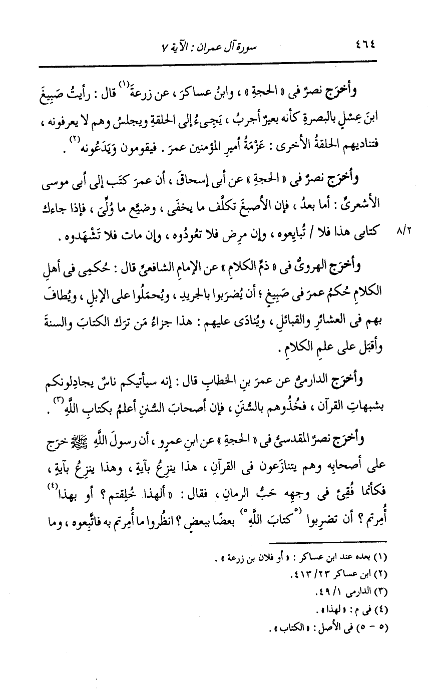 وأخرج ابن الأنباري في المصاحف ونصر المقدسي في الحجة ، وَابن عساكر عن السائب بن يزيد ، أن رجلا قال لعمر : إني مررت برجل يسأل عن تفسير مشكل القرآن ، فقال عمر : اللهم أمكني منه ، فدخل الرجل يوما على عمر فسأله فقام عمر فحسر عن ذراعيه وجعل يجلده ثم قال : ألبسوه تبانا واحملوه على قتب وابلغوا به حيه ثم ليقم خطيب فليقل إن صبيغا طلب العلم فأخطأه فلم يزل وضيعا في قومه بعد أن كان سيدا فيهم.
