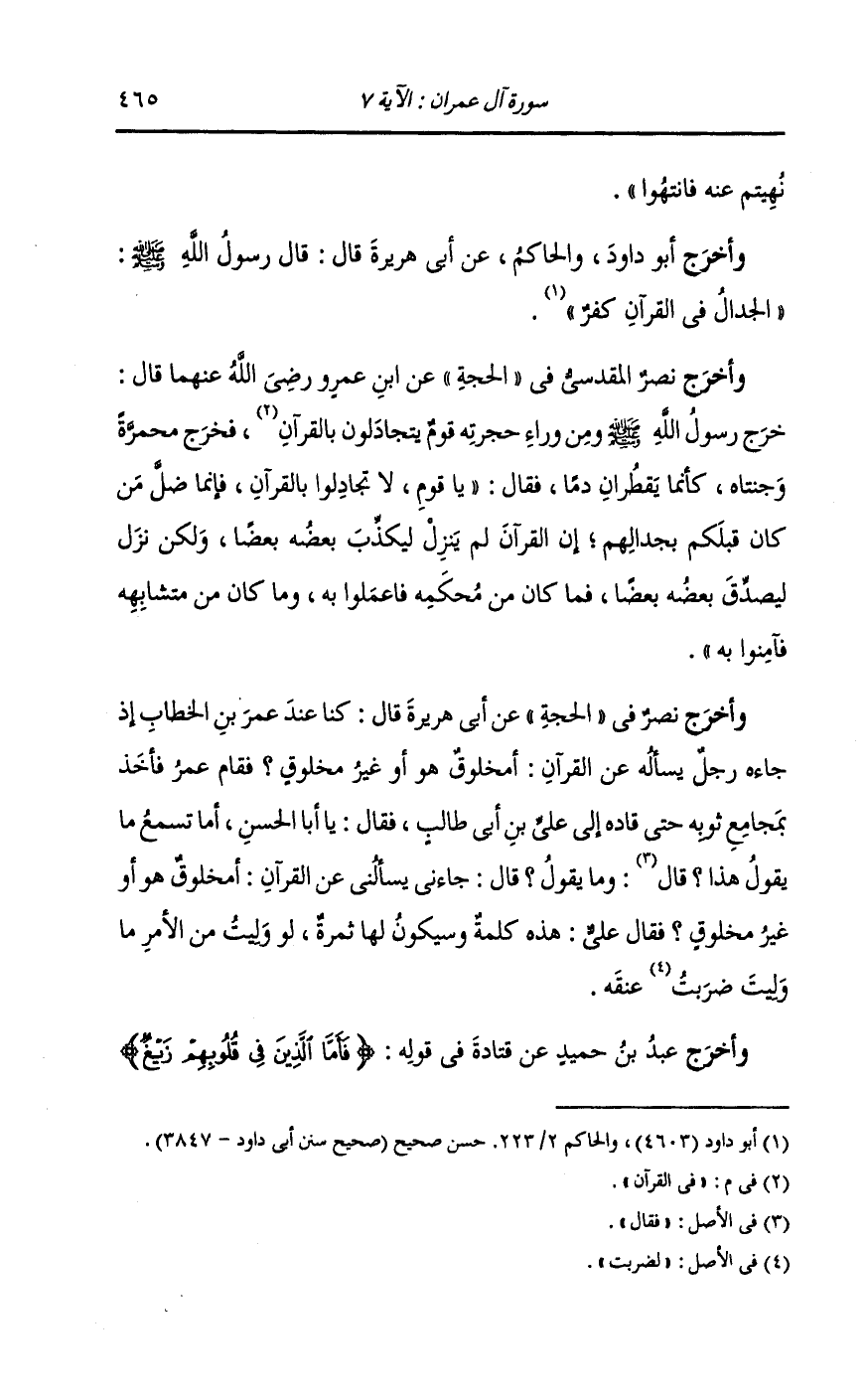 وأخرج نصر المقدسي في الحجة عن ابن عمرو أن رسول الله صلى الله عليه وسلم ، خرج على أصحابه وهم يتنازعون في القرآن ، هذا ينزع بآية وهذا ينزع بآية ، فكأنما فقى ء في وجهه حب الرمان فقال : ألهذا خلقتم أو لهذا أمرتم أن تضربوا كتاب الله بعضه ببعض انظروا ما أمرتم به فاتبعوه وما