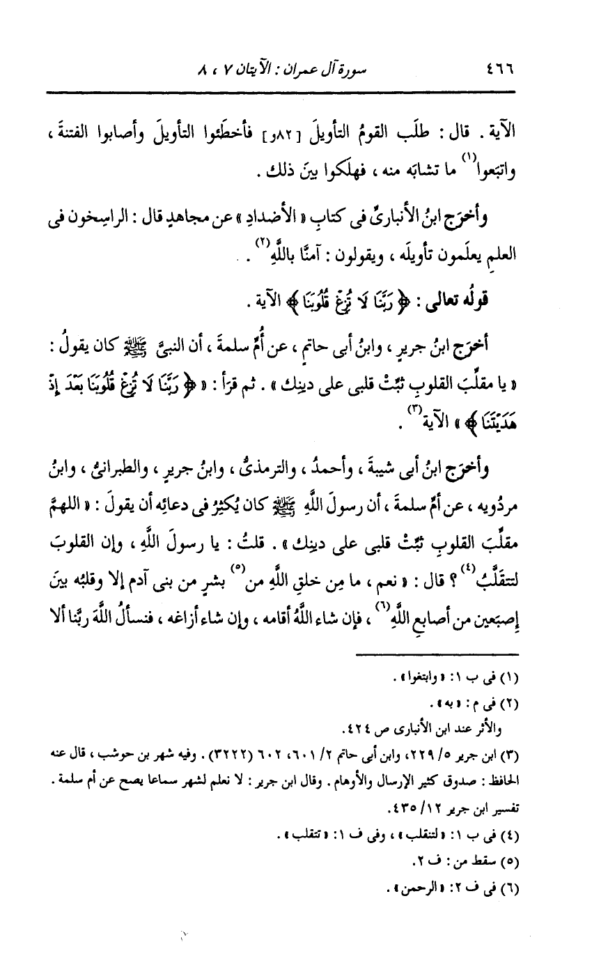 وأخرج نصر المقدسي في الحجة عن ابن عمرو رضي الله عنهما قال خرج رسول الله صلى الله عليه وسلم ، ومن وراء حجرته قوم يتجادلون في القرآن ، فخرج محمرة وجنتاه كأنما تقطران دما فقال : يا قوم لا تجادلوا بالقرآن فإنما ضل من كان قبلكم بجدالهم إن القرآن لم ينزل ليكذب بعضه بعضا ولكن نزل ليصدق بعضه بعضا فما كان من محكمه فاعملوا به وما كان من متشابهه فآمنوا به.