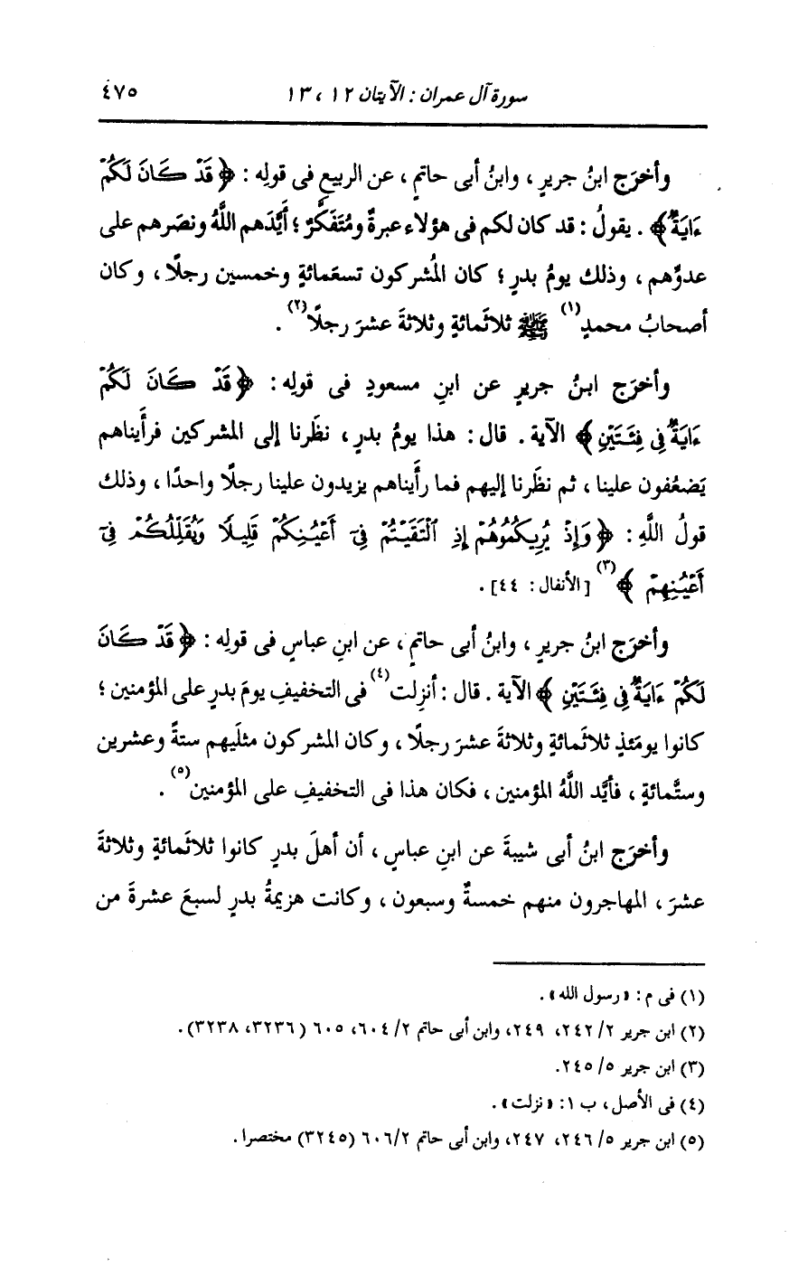 وأَخرج ابن جرير عن ابن مسعود في قوله {قد كان لكم آية في فئتين} الآية ، قال : هذا يوم بدر فنظرنا إلى المشركين فرأيناهم يضعفون علينا ثم نظرنا إليهم فما رأيناهم يزيدون علينا رجلا واحدا ، وذلك قول الله (وإذ يريكموهم إذ التقيتم في أعينكم قليلا ويقللكم في أعينهم) (الأنفال الآية 44).