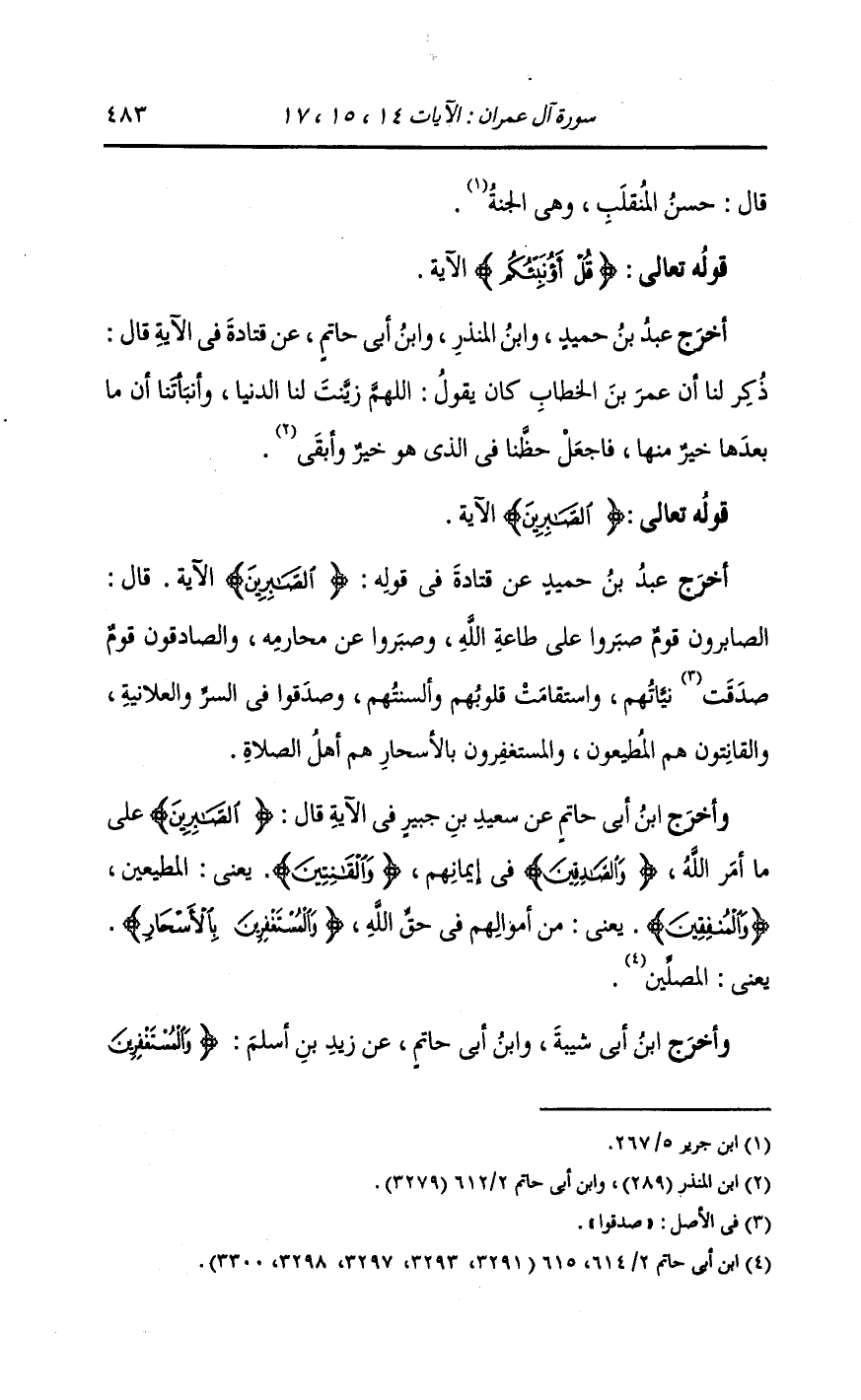 أخرج عَبد بن حُمَيد عن قتادة في قوله {الصابرين} الآية ، قال : (الصابرون) قوم صبروا على طاعة الله وصبروا عن محارمه (و الصادقون) قوم صدقت نياتهم واستقامت قلوبهم وألسنتهم وصدقوا في السر والعلانية (و القانتون) هم المطيعون (و المستغفرون بالأسحار) هم أهل الصلاة.