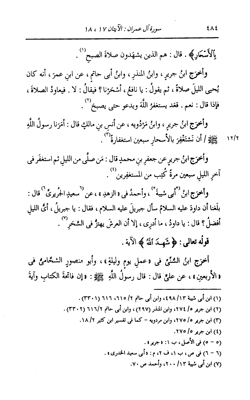 وأَخرج ابن جرير عن جعفر بن محمد قال : من صلى من الليل ثم استغفر في آخر الليل سبعين مرة كتب من المستغفرين.