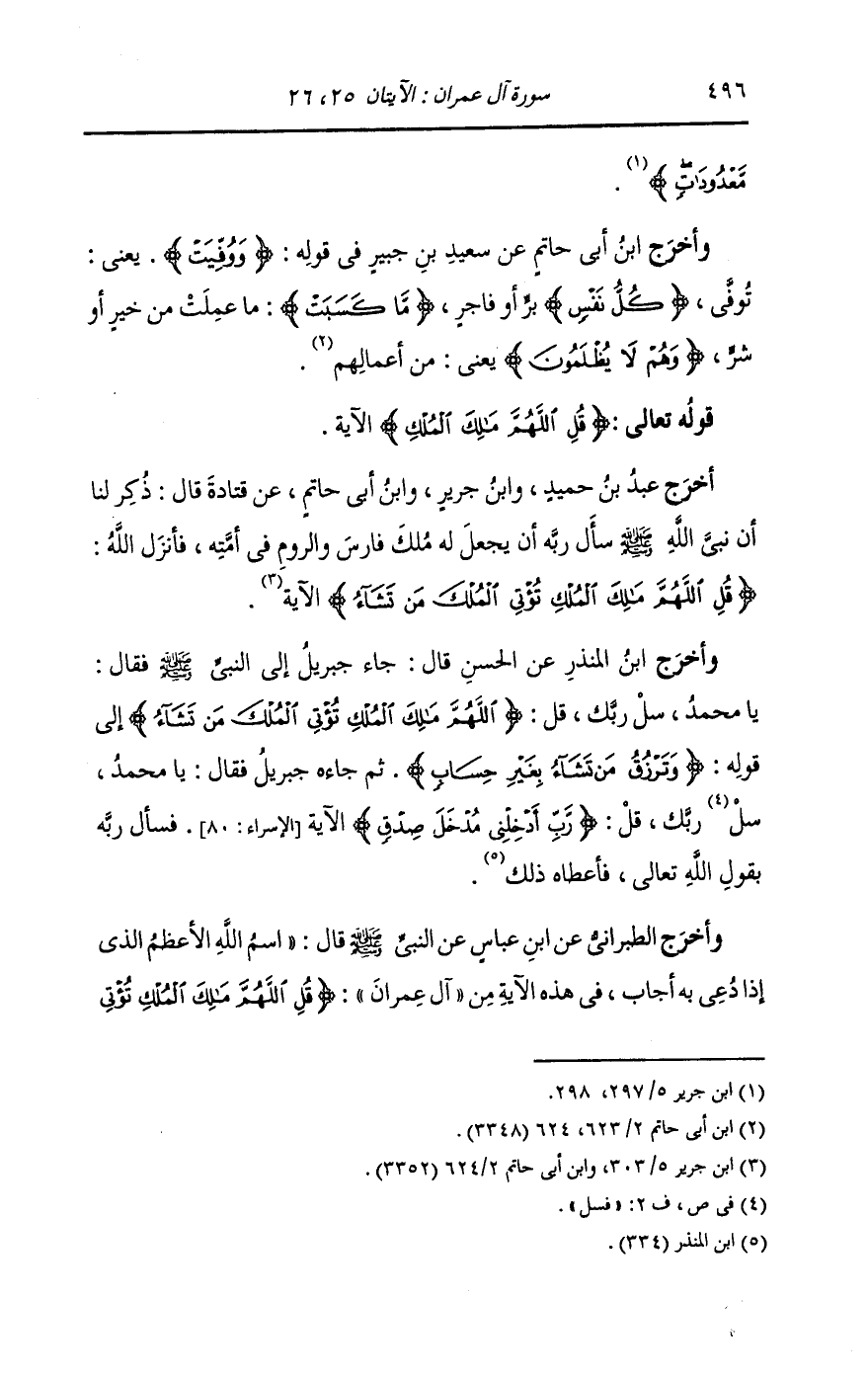 وأخرج الطبراني عن ابن عباس عن النَّبِيّ صلى الله عليه وسلم ، قال : اسم الله الأعظم الذي اذا دعي به أجاب في هذه الآية من آل عمران {قل اللهم مالك الملك تؤتي الملك من تشاء} إلى آخر الآية