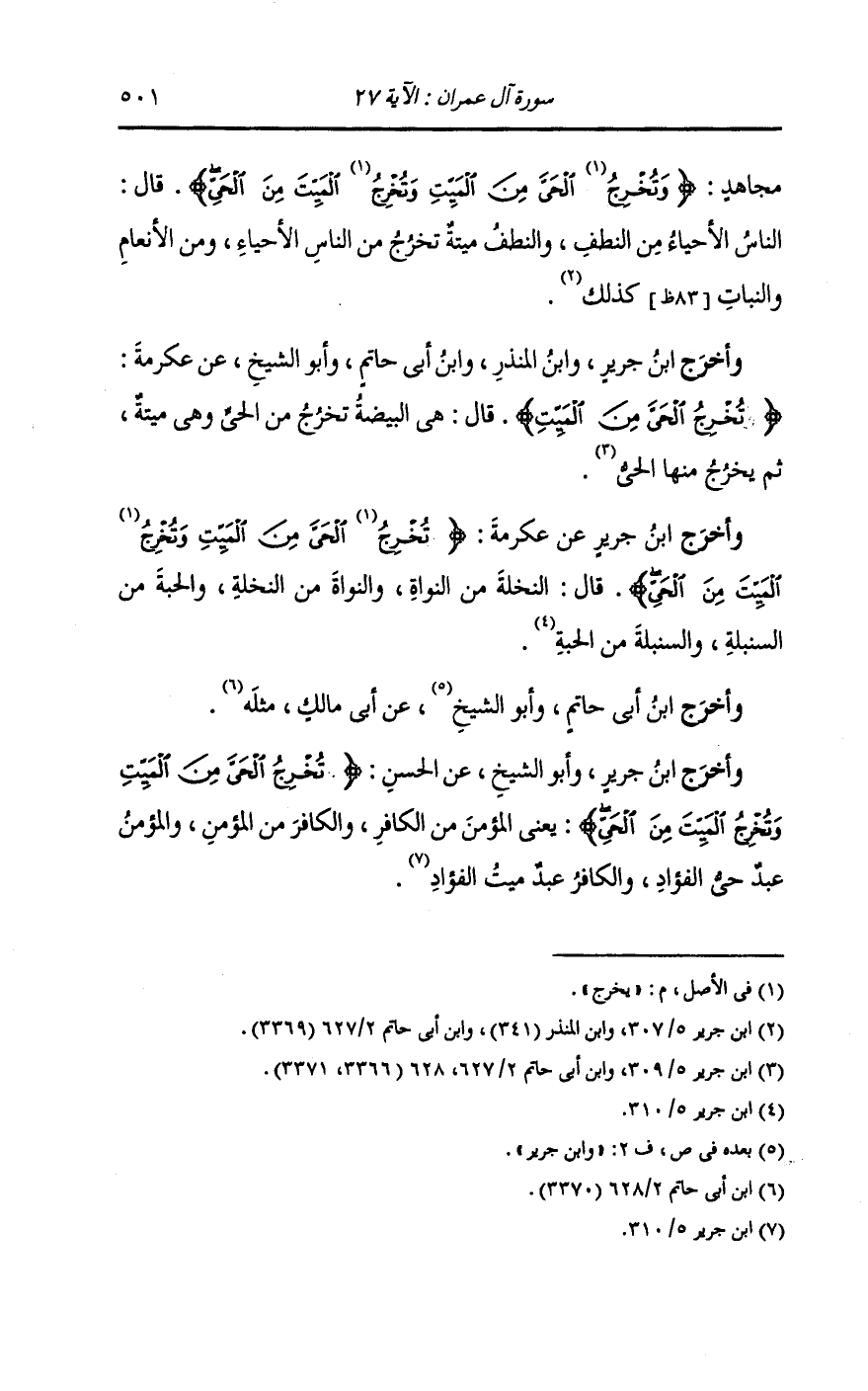 وأخرج ابن جرير عن عكرمة {وتخرج الحي من الميت وتخرج الميت من الحي} قال : النخلة من النواة والنواة من النخلة والحبة من السنبلة والسنبلة من الحبة.