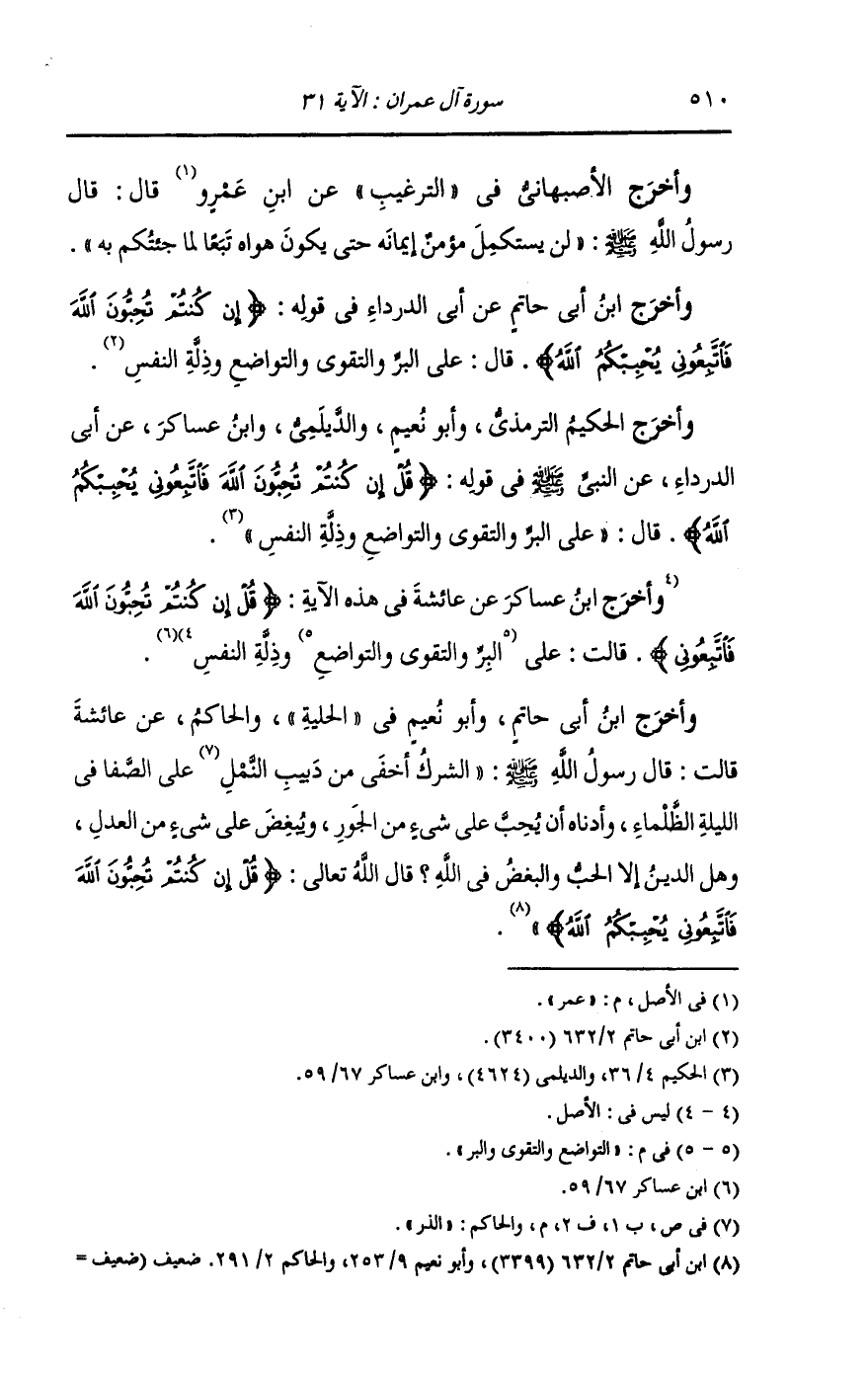 وأخرج ابن أبي حاتم عن أبي الدرداء في قوله {إن كنتم تحبون الله فاتبعوني} قال : على البر والتقوى والتواضع وذلة النفس.