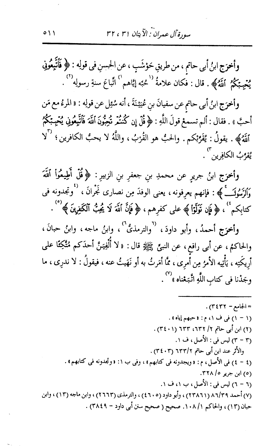 وأخرج ابن أبي حاتم عن سفيان بن عيينة أنه سئل عن قوله المرء مع من أحب فقال : ألم تسمع قول الله {قل إن كنتم تحبون الله فاتبعوني يحببكم الله} يقول : يقربكم ، والحب هو القرب والله لا يحب الكافرين لا يقرب الكافرين.