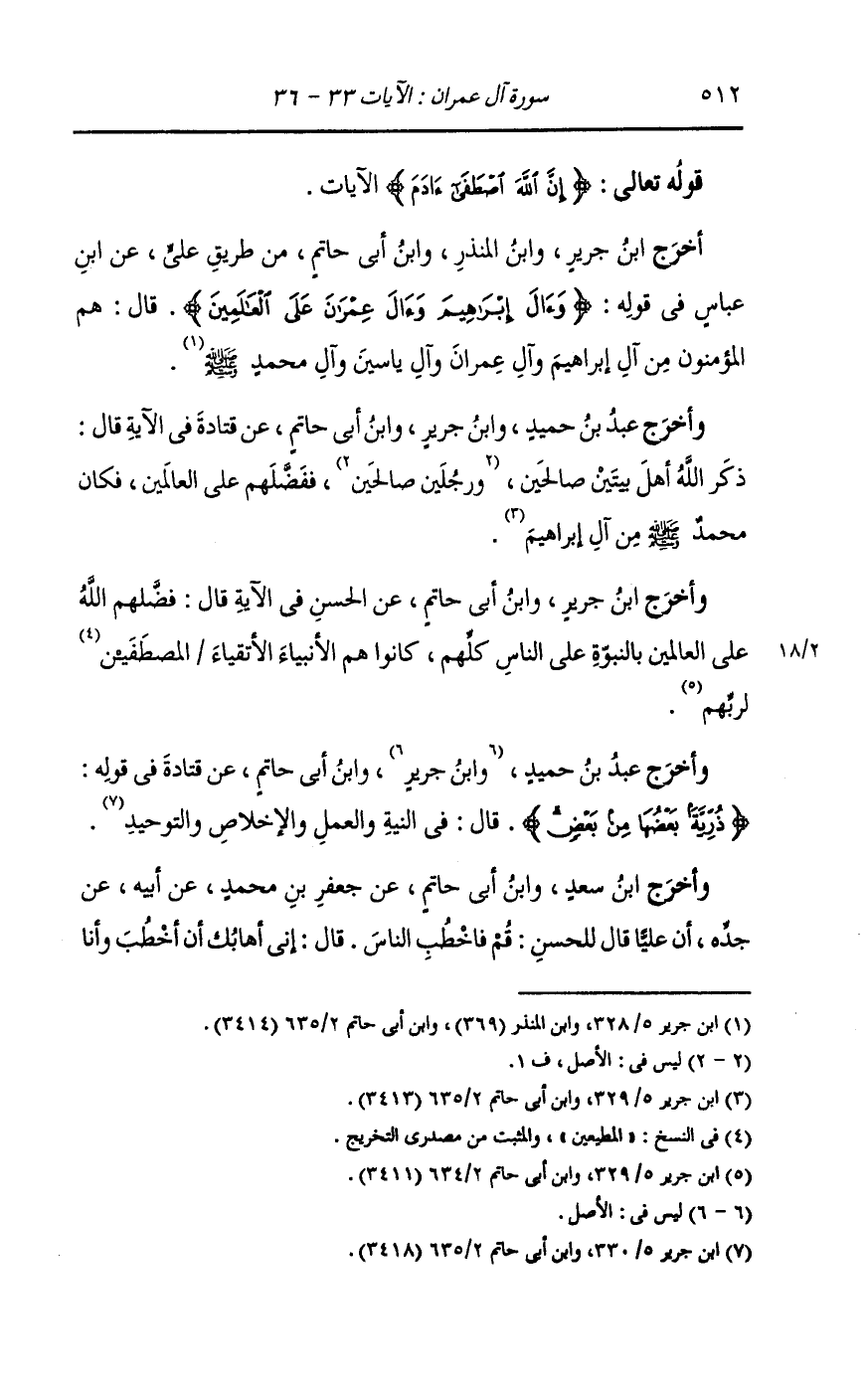 وأخرج عَبد بن حُمَيد وان جرير ، وَابن أبي حاتم عن قتادة في الآية قال : ذكر الله أهل بيتين صالحين ورجلين صالحين ففضلهم على العالمين فكان محمد صلى الله عليه وسلم من آل إبراهيم.