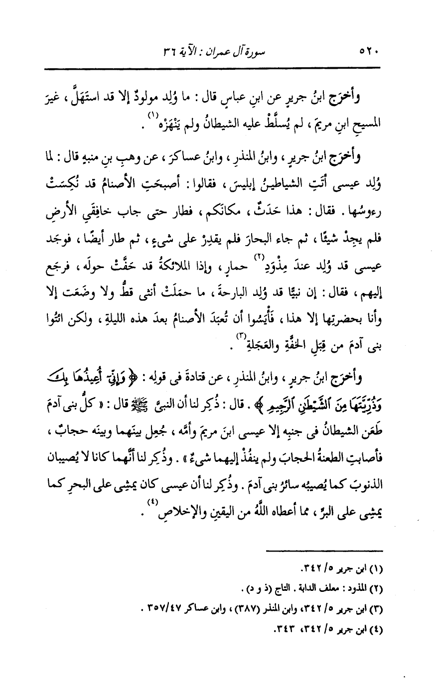 وأخرج ابن جرير ، وَابن المنذر عن قتادة في قوله {وإني أعيذها بك وذريتها من الشيطان الرجيم} قال : ذكر لنا أن النَّبِيّ صلى الله عليه وسلم قال : كل بني آدم طعن الشيطان في جنبه إلا عيسى بن مريم وأمه جعل بينهما وبينه حجاب فأصابت الطعنة الحجاب ولم ينفذ اليهما شيء ، وذكر لنا أنهما كانا لا يصيبان الذنوب كما يصيبه سائر بني آدم ، وذكر لنا أن عيسى عليه السلام كان يمشي على البحر كما يمشي على البر مما أعطاه الله من اليقين والإخلاص