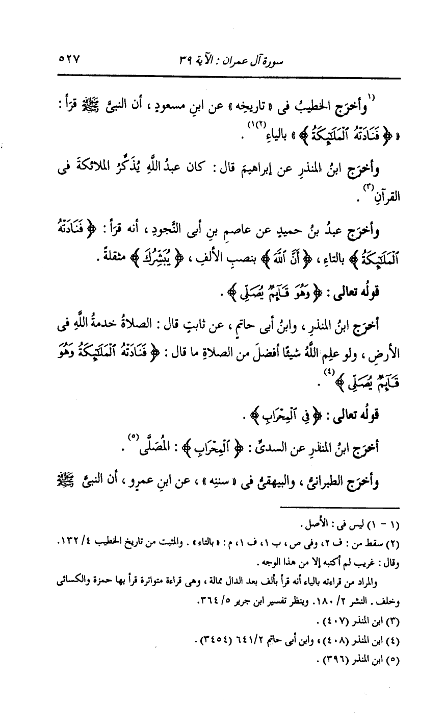 وأخرج عَبد بن حُمَيد عن عاصم بن أبي النجود أنه قرأ {فنادته الملائكة} بالتاء {إن الله} بنصب الألف {يبشرك} مثقلة ، قوله تعالى {وهو قائم يصلي}.