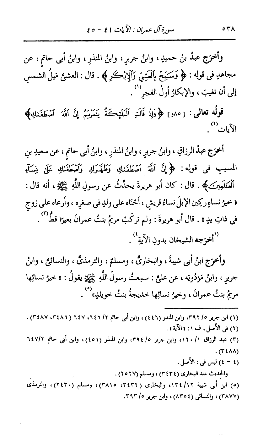 وأخرج ابن أبي شيبة والبخاري ومسلم والترمذي والنسائي ، وَابن جَرِير ، وَابن مردويه عن علي سمعت رسول الله يقول : خير نسائها مريم بنت عمران وخير نسائها خديجة بنت خويلد