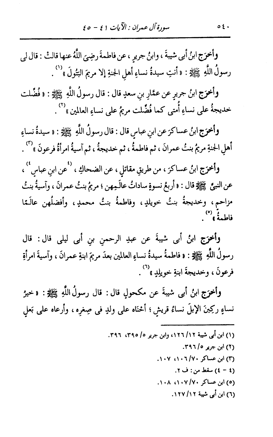 وأخرج ابن أبي شيبة عن عبد الرحمن بن أبي ليلى قال : قال رسول الله صلى الله عليه وسلم : فاطمة سيدة نساء العالمين بعد مريم ابنة عمران وآسية امرأة فرعون وخديجة ابنة خويلد.