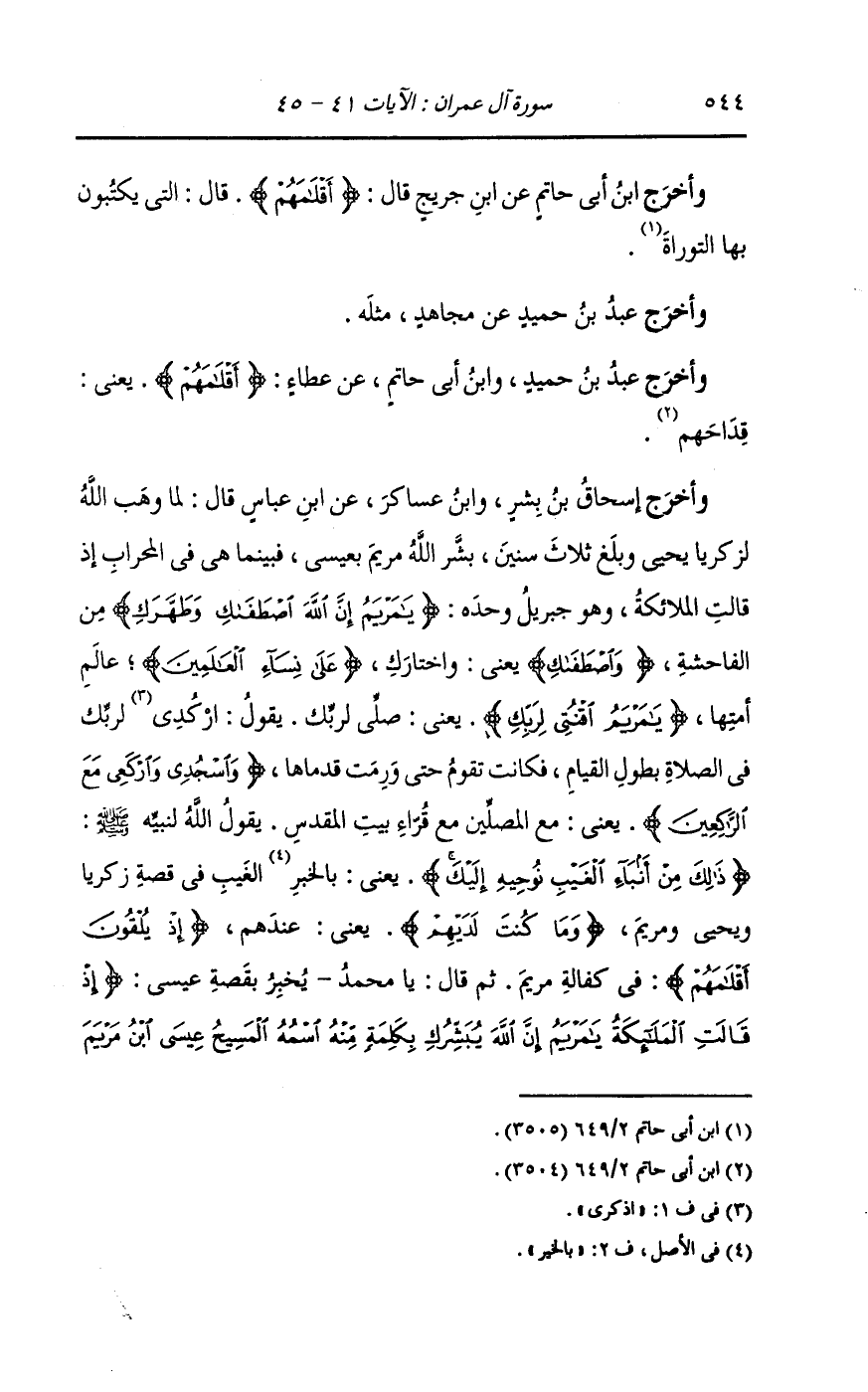 وأخرج إسحاق بن بشر ، وَابن عساكر عن ابن عباس قال لما وهب الله لزكريا يحيى وبلغ ثلاث سنين بشر الله مريم بعيسى فبينما هي في المحراب إذ قالت الملائكة - وهو جبريل وحده - {يا مريم إن الله اصطفاك وطهرك} من الفاحشة {واصطفاك} يعني اختارك {على نساء العالمين} عالم أمتها {يا مريم اقنتي لربك} يعني صلي لربك يقول : اركدي لربك في الصلاة بطول القيام فكانت تقوم حتى ورمت قدماها {واسجدي واركعي مع الراكعين} يعني مع المصلين مع قراء بيت المقدس ، يقول الله لنبيه صلى الله عليه وسلم {ذلك من أنباء الغيب نوحيه إليك} يعني بالخبر {الغيب} في قصة زكريا ويحيى ومريم {وما كنت لديهم} يعني عندهم {إذ يلقون أقلامهم} في كفالة مريم ثم قال يا محمد يخبر بقصة عيسى {إذ قالت الملائكة يا مريم إن الله يبشرك بكلمة منه اسمه المسيح عيسى ابن مريم