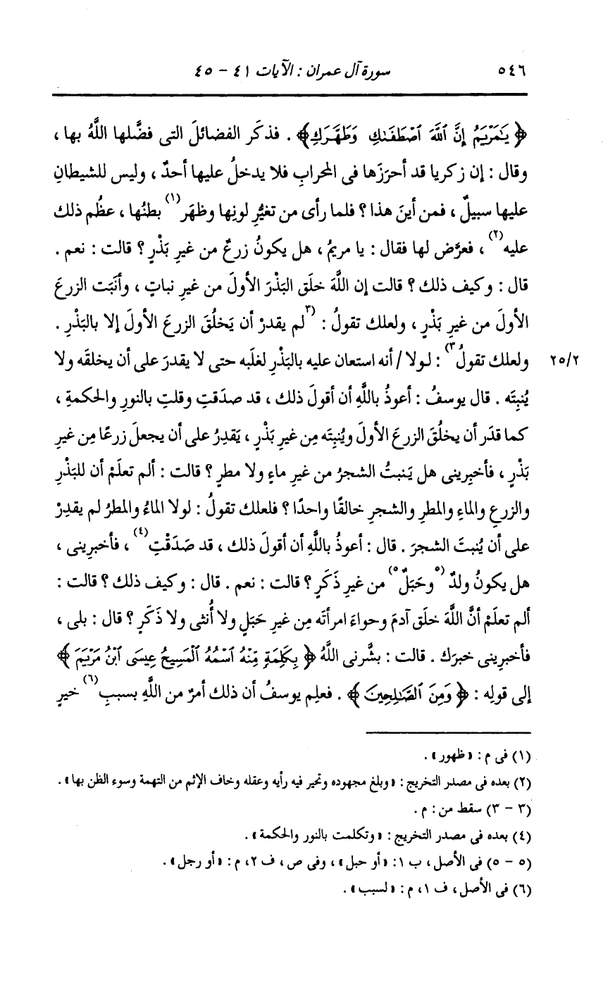 {يا مريم إن الله اصطفاك وطهرك} فكان يعجب يوسف ما يسمع ، فلما استبان ليوسف حمل مريم وقع في نفسه من أمرها حتى كاد أن يفتتن فلما أراد أن يتهمها في نفسه ذكر ما طهرها الله واصطفاها وما وعد الله أمها أنه يعيذها وذريتها من الشيطان الرجيم وما سمع من قول الملائكة {يا مريم إن الله اصطفاك وطهرك} فذكر الفضائل التي فضلها الله تعالى بها وقال : إن زكريا قد أحرزها في المحراب فلا يدخل عليها أحد وليس للشيطان عليها سبيل فمن أين هذا فلما رأى من تغير لونها وظهور بطنها عظم ذلك عليه فعرض لها فقال : يا مريم هل يكون زرع من غير بذر قالت : نعم ، قال : وكيف ذلك قالت : إن الله خلق البذرالأول من غير نبات وأنبت الزرع الأول من غير بذر ولعلك تقول : لولا أنه استعان عليه بالبذر لغلبه حتى لا يقدر على أن يخلقه ولا ينبته ، قال يوسف : أعوذ بالله أن أقول ذلك قد صدقت وقلت بالنور والحكمة وكما قدر أن يخلق الزرع الأول وينبته من غير بذر يقدر على أن يجعل زرعا من غير بذر فأخبريني هل ينبت الشجر من غير ماء ولا مطر قالت : ألم تعلم أن للبذور والزرع والماء والمطر والشجر خالقا واحدا فلعلك تقول لولا الماء والمطر لم يقدر على أن ينبت الشجر ، قال : أعوذ بالله أن أقول ذلك قد صدقت ، فأخبريني هل يكون ولد أو رجل من غير ذكر قالت : نعم ، قال : وكيف ذلك قالت : ألم تعلم أن الله خلق آدم وحواء امرأته من غير حبل ولا أنثى ولا ذكر قال : بلى ، فأخبريني خبرك قالت : بشرني الله {بكلمة منه اسمه المسيح عيسى ابن مريم} إلى قوله {ومن الصالحين} فعلم يوسف أن ذلك أمر من الله لسبب خير
