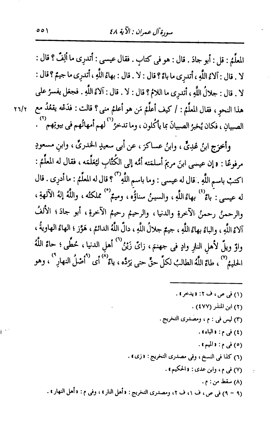 المعلم : قل أبو جاد (قصد بها أيحد) ، قال : هو في كتاب ، فقال عيسى : أتدري ما ألف قال : لا ، قال : آلاء الله ، أتدري ما باء