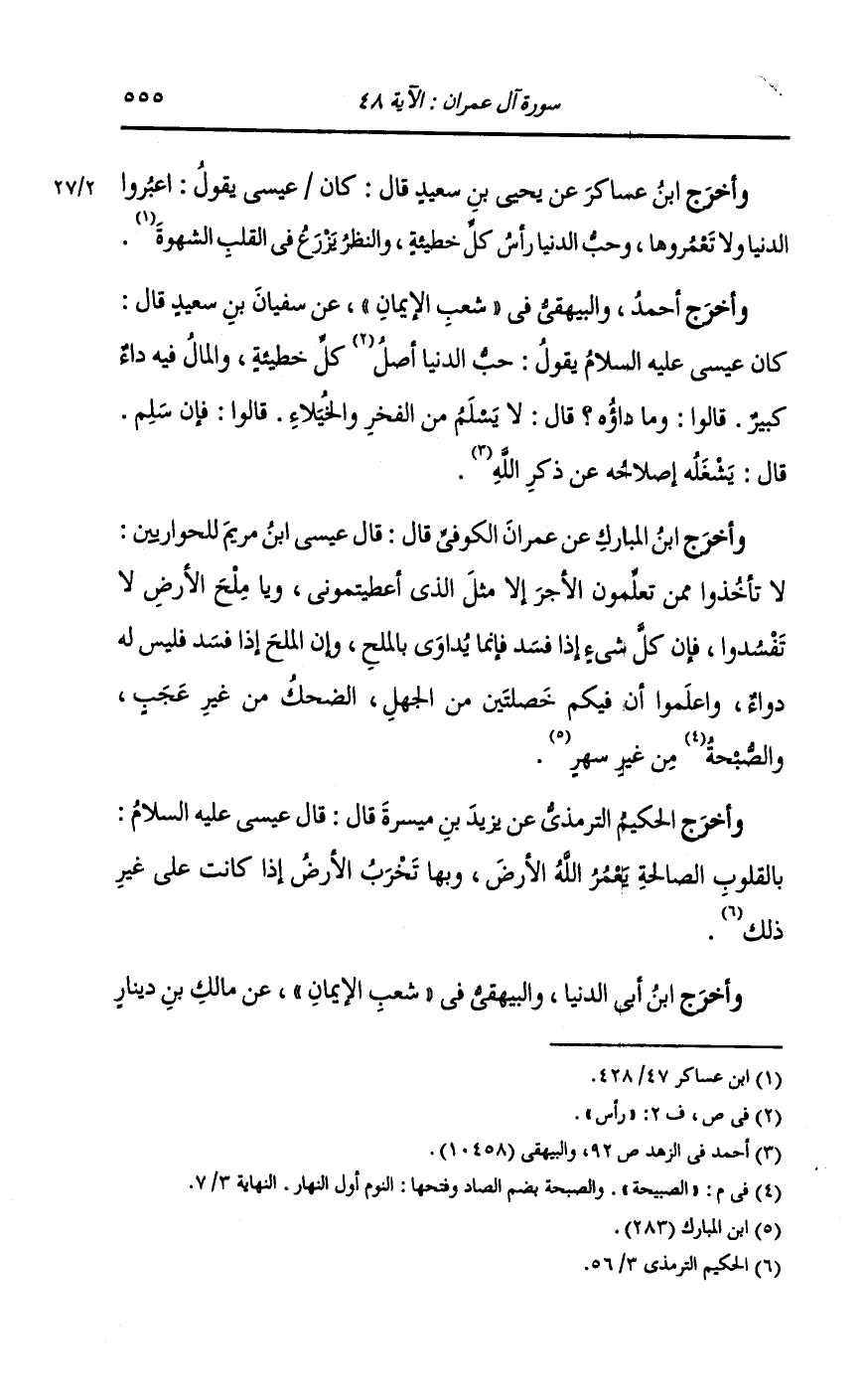 وأخرج ابن المبارك عن عمران الكوفي قال : قال عيسى بن مريم للحواريين : لا تأخذوا ممن تعلمون الأجر الأمثل الذي أعطيتموني ويا ملح الأرض لا تفسدوا فإن كل شيء إذا فسد فإنما يداوى بالملح وإن الملح إذا فسد فليس له دواء واعلموا أن فيكم خصلتين من الجهل ، الضحك من غير عجب والصبيحة من غير سهر.