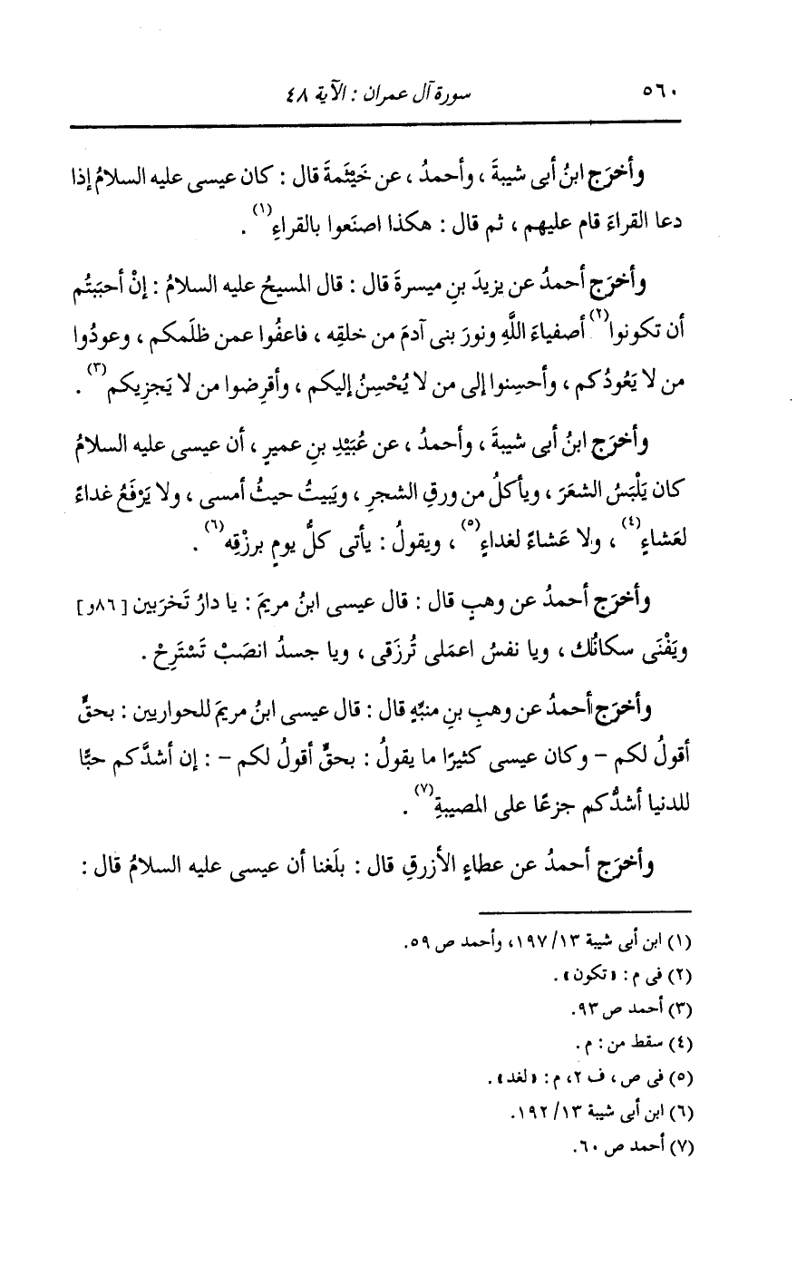 وأخرج ابن أبي شيبة وأحمد عن خثيمة قال : كان عيسى عليه السلام إذا دعا القراء قام عليهم ثم قال : هكذا اصنعوا بالقراء.