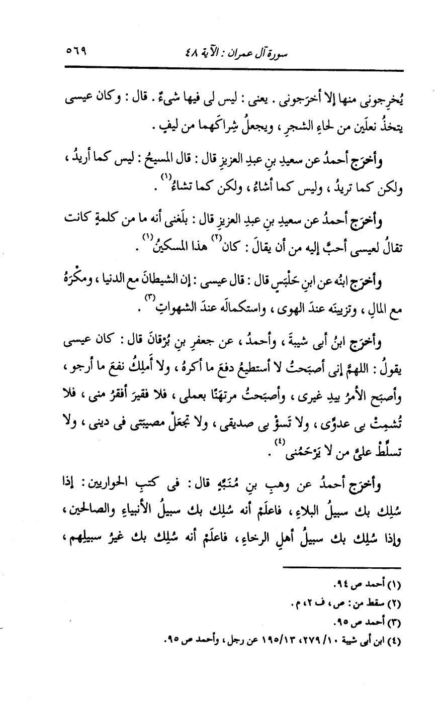 وأخرج ابن أبي شيبة وأحمد عن جعفر بن برقان قال : كان عيسى يقول : اللهم إني أصبحت لا أستطيع دفع ما أكره ولا أملك نفع ما أرجو وأصبح الأمر بيد غيري وأصبحت مرتهنا بعملي فلا فقير أفقر مني فلا تشمت بي عدوي ولا تسيء بي صديقي ولا تجعل مصيبتي في ديني ولا تسلط علي من لا يرحمني.