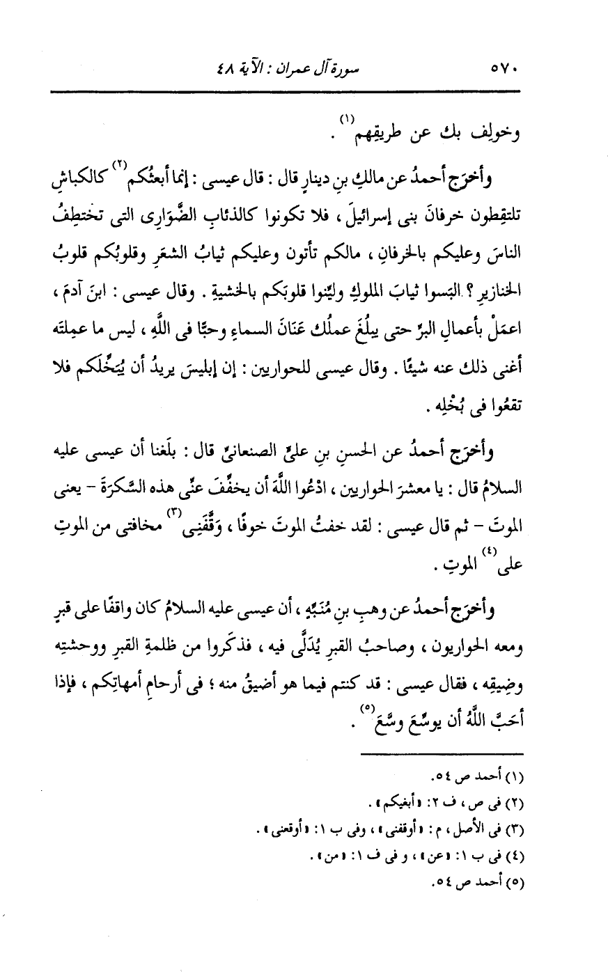 وأخرج أحمد عن مالك بن دينار قال : قال عيسى : انما أبعثكم كالكباش تلتقطون خراف بني إسرائيل فلا تكونوا كالذئاب الضواري التي تخطتف الناس وعليكم بالخرفان ما لكم تأتون عليكم ثياب الشعر وقلوبكم قلوب الخنازير البسوا ثياب الملوك ولينوا قلوبكم بالخشية ، وقال عيسى : يا ابن آدم اعمل بأعمال البر حتى يبلغ عملك عنان السماء فإن لم يكن حبا في الله ما أغنى ذلك عنك شيئا ، وقال عيسى للحواريين : إن إبليس يريد أن يبخلكم فلا تقعوا في بخله.