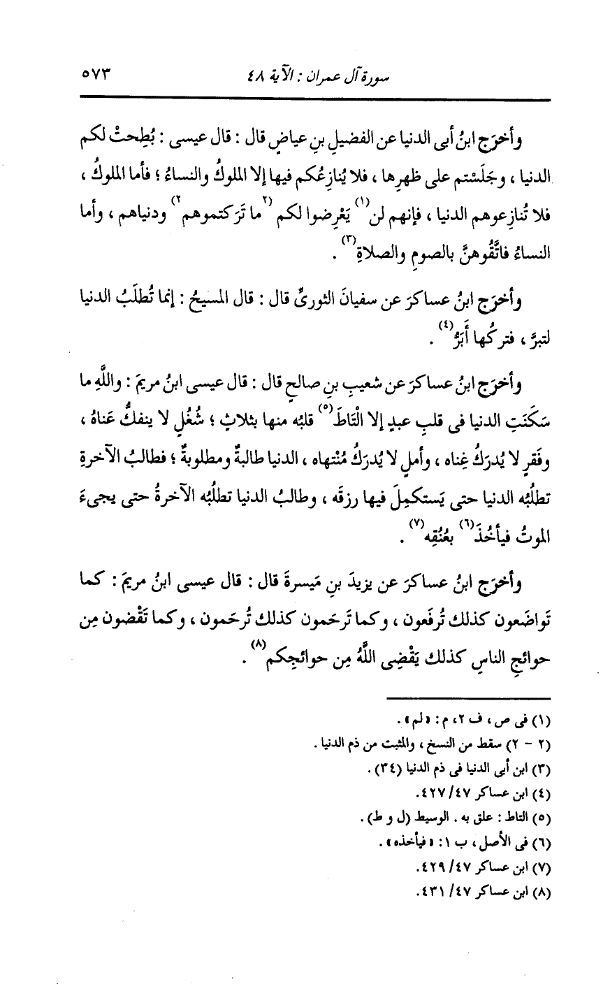 وأخرج ابن أبي الدنيا عن الفضيل بن عياض قال : قال عيسى : بطحت لكم الدنيا وجلستم على ظهرها فلا ينازعكم فيها إلا الملوك والنساء ، فأما الملوك فلا تنازعوهم الدنيا فإنهم لم يعرضوا لكم دنياهم وأما النساء فاتقوهن بالصوم والصلاة.