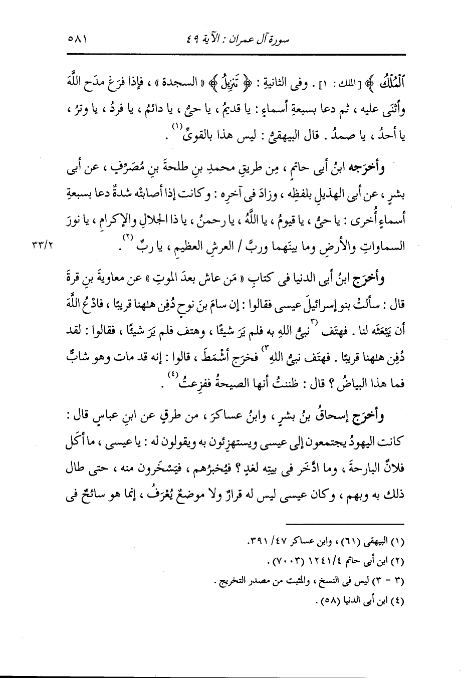 الملك) (الملك الآية 1) وفي الثانية (تنزيل السجدة) (السجدة الآية 2) فإذا فرغ مدح الله وأثنى عليه ثم دعا بسبعة أسماء : يا قديم يا حي يا دائم يا فرد يا وتر يا أحد يا صمد ، قال البيهقي : ليس هذا بالقوي ، وأخرجه ابن أبي حاتم من طريق محمد بن طلحة بن مصرف عن أبي بشر عن أبي الهذيل بلفظه وزاد في آخره : وكانت إذا أصابته شدة دعا بسبعة أسماء أخرى : يا حي يا قيوم يا الله يا رحمن يا ذا الجلال والاكرام يا نور السموات والأرض وما بينهما ورب العرش العظيم يا رب.