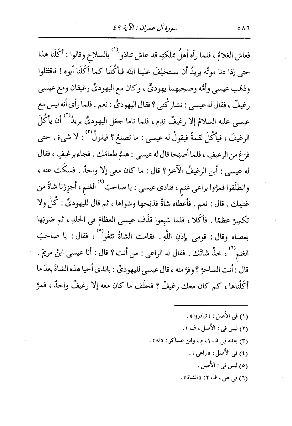 وذهب عيسى وأمه وصحبهما يهودي وكان مع إليهودي رغيفان ومع عيسى رغيف ، فقال له عيسى : تشاركني فقال اليهودي : نعم ، فلما رأى أنه ليس مع عيسى عليه السلام إلا رغيف ندم فلما ناما جعل اليهودي يريد أن يأكل الرغيف ، فيأكل لقمة فيقول له عيسى : ما تصنع فيقول له : لا شيء ، ، حتى فرغ من الرغيف ، فلما أصبحا قال له عيسى : هلم بطعامك فجاء برغيف فقال له عيسى : أين الرغيف الآخر قال : ما كان معي إلا واحد ، فسكت عنه وانطلقوا فمروا براعي غنم فنادى عيسى : يا صاحب الغنم أجزرنا شاة من غنمك ، قال : نعم ، فأعطاه شاة فذبحها وشواها ثم قال لليهودي : كل ولا تكسر عظما ، فأكلا فلما شبعوا قذف عيسى العظام في الجلد ثم ضربها بعصاه وقال : قومي بإذن الله ، فقامت الشاة تثغوا فقال : يا صاحب الغنم خذ شاتك فقال له الراعي : من أنت قال : أنا عيسى ابن مريم قال : أنت الساحر وفر منه ، قال عيسى لليهودي : بالذي أحيا هذه الشاة بعد ما أكلناها كم كان معك من الأرغفة أو - كم رغيف كان معك - فحلف ما كان معه إلا رغيف واحد ، فمر