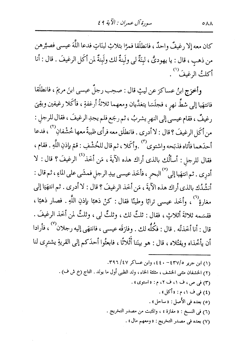 وأخرج ابن عساكر عن ليث قال : صحب رجل عيسى بن مريم فانطلقا فانتهيا إلى شاطى ء نهر فجلسا يتغديان ومعهما ثلاثة أرغفة فأكلا الرغيفين وبقي رغيف ، فقام عيسى إلى النهر يشرب ثم رجع فلم يجد الرغيف ، فقال للرجل : من أكل الرغيف قال : لا أدري فانطلق معه فرأى ظبية معها خشفان فدعا أحدهما فأتاه فذبحه وشواه وأكلا ثم قال للخشف : قم بإذن الله فقام فقال للرجل : أسألك بالذي أراك هذه الآية من أكل الرغيف قال : لا أدري ثم انتهيا إلى البحر فأخذ عيسى بيد الرجل فمشى على الماء ثم قال : أنشدك بالذي أراك هذه الآية من أخذ الرغيف قال : لا أدري ، ثم انتهيا إلى مفازة وأخذ عيسى ترابا وطينا فقال : كن ذهبا بإذن الله ، فصار ذهبا فقسمه ثلاثة أثلاث فقال : ثلث لك وثلث لي وثلث لمن أخذ الرغيف ، قال : أنا أخذته ، قال : فكله لك وفارقه عيسى فانتهى إليه رجلان فأرادا أن يأخذاه ويقتلاه قال : هو بيننا أثلاثا فابعثوا أحدكم إلى القرية يشتري لنا