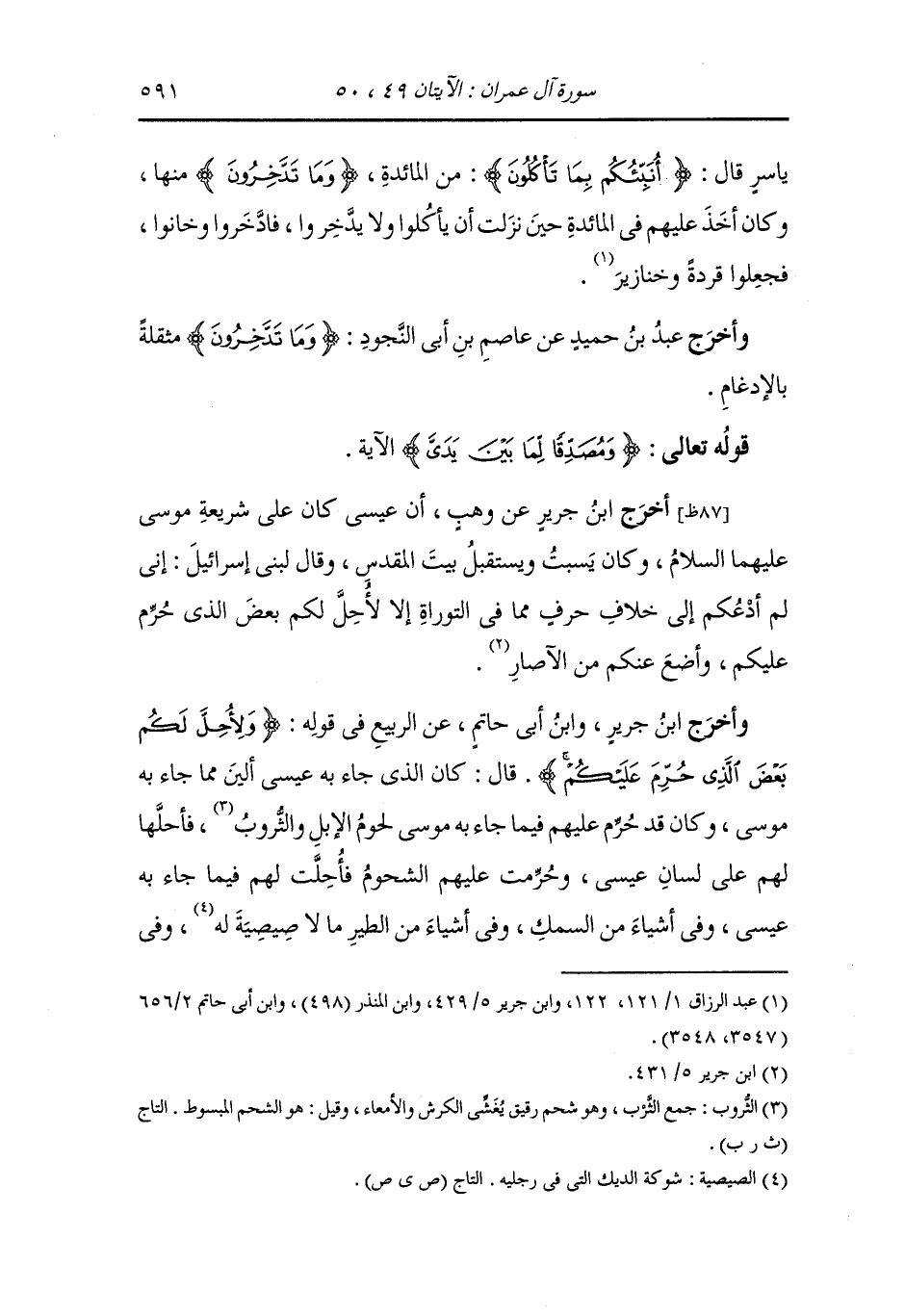 وأخرج ابن جرير ، وَابن أبي حاتم عن الربيع في قوله {ولأحل لكم بعض الذي حرم عليكم} قال : كان الذي جاء به عيسى ألين مما جاء به موسى وكان قد حرم عليهم فيما جاء به موسى لحوم الإبل والثروب فأحلهما لهم على لسان عيسى وحرمت عليهم الشحوم فأحلت لهم فيما جاء به عيسى وفي أشياء من السمك وفي أشياء من الطير ما لا صيصية له (الصيصية في اللغة شوكة الديك وأراد بها هنا مخلب الطير) وفي