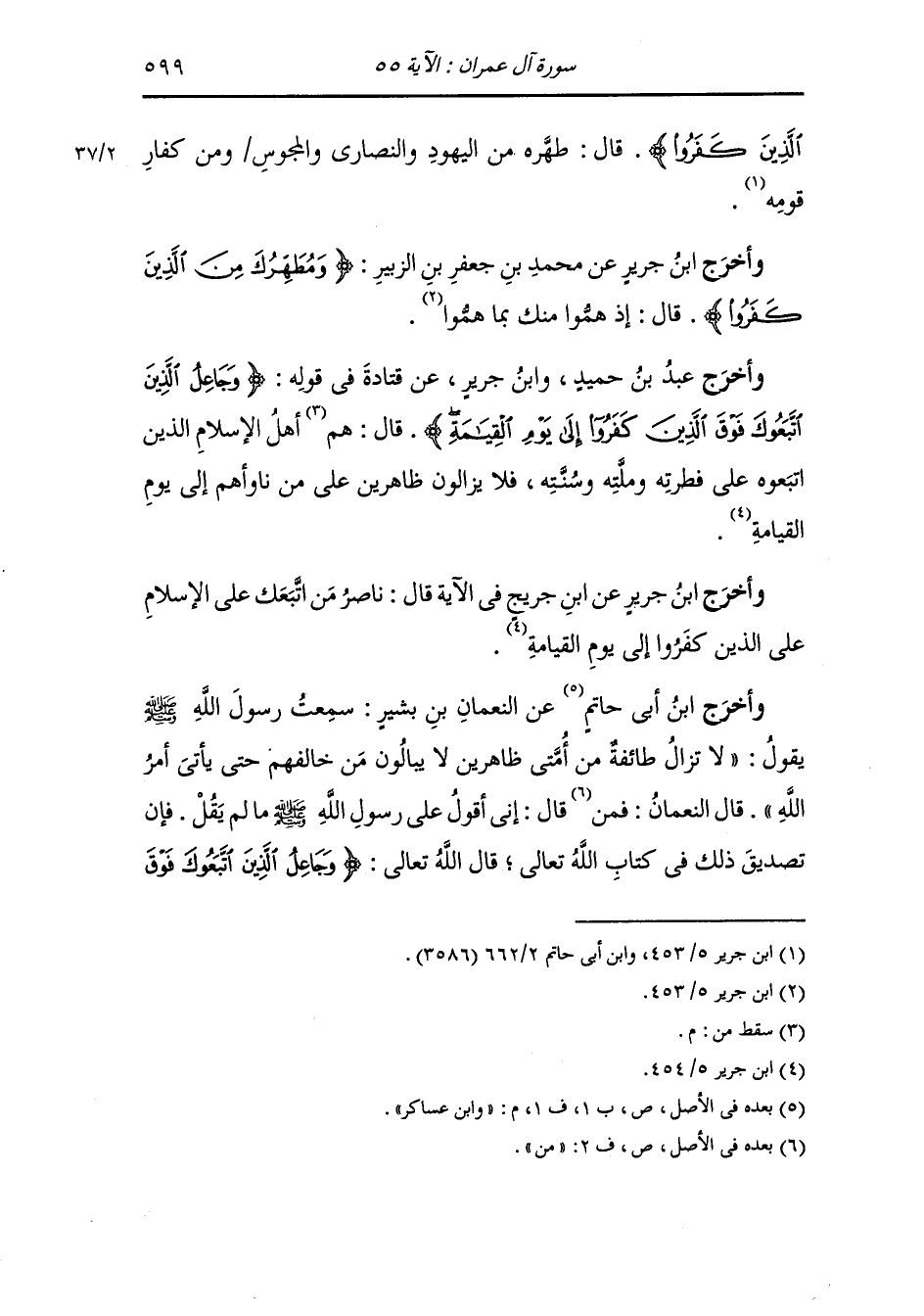 وأخرج عَبد بن حُمَيد ، وَابن جَرِير عن قتادة في قوله {وجاعل الذين اتبعوك فوق الذين كفروا إلى يوم القيامة} قال : أهل الإسلام الذين اتبعوه على فطرته وملته وسنته فلا يزالون ظاهرين على من ناوأهم إلى يوم القيامة.