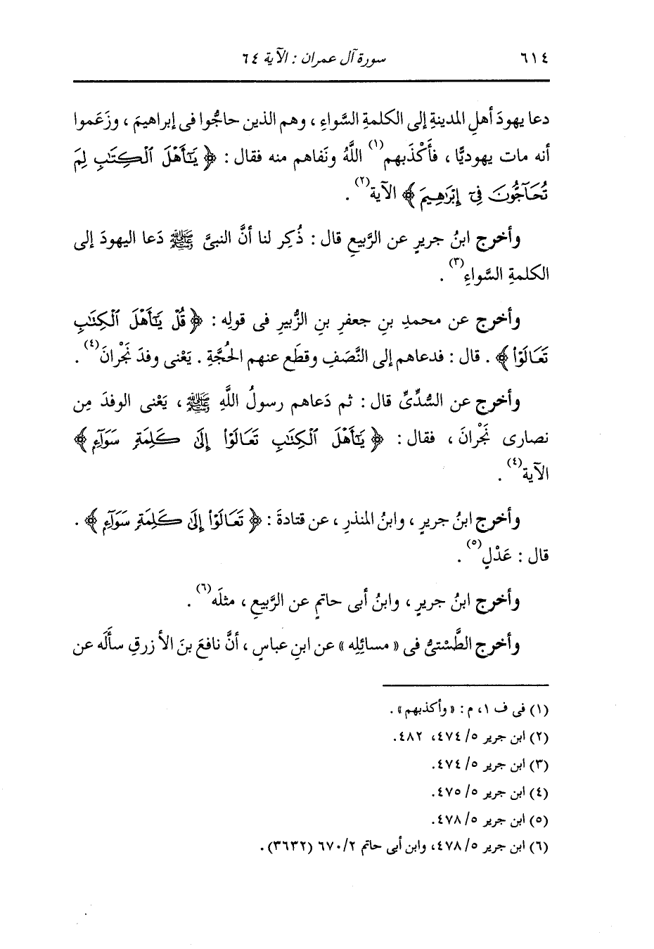 وأخرج ابن جرير عن الربيع قال : ذكر لنا أن النَّبِيّ صلى الله عليه وسلم دعا اليهود إلى الكلمة السواء.