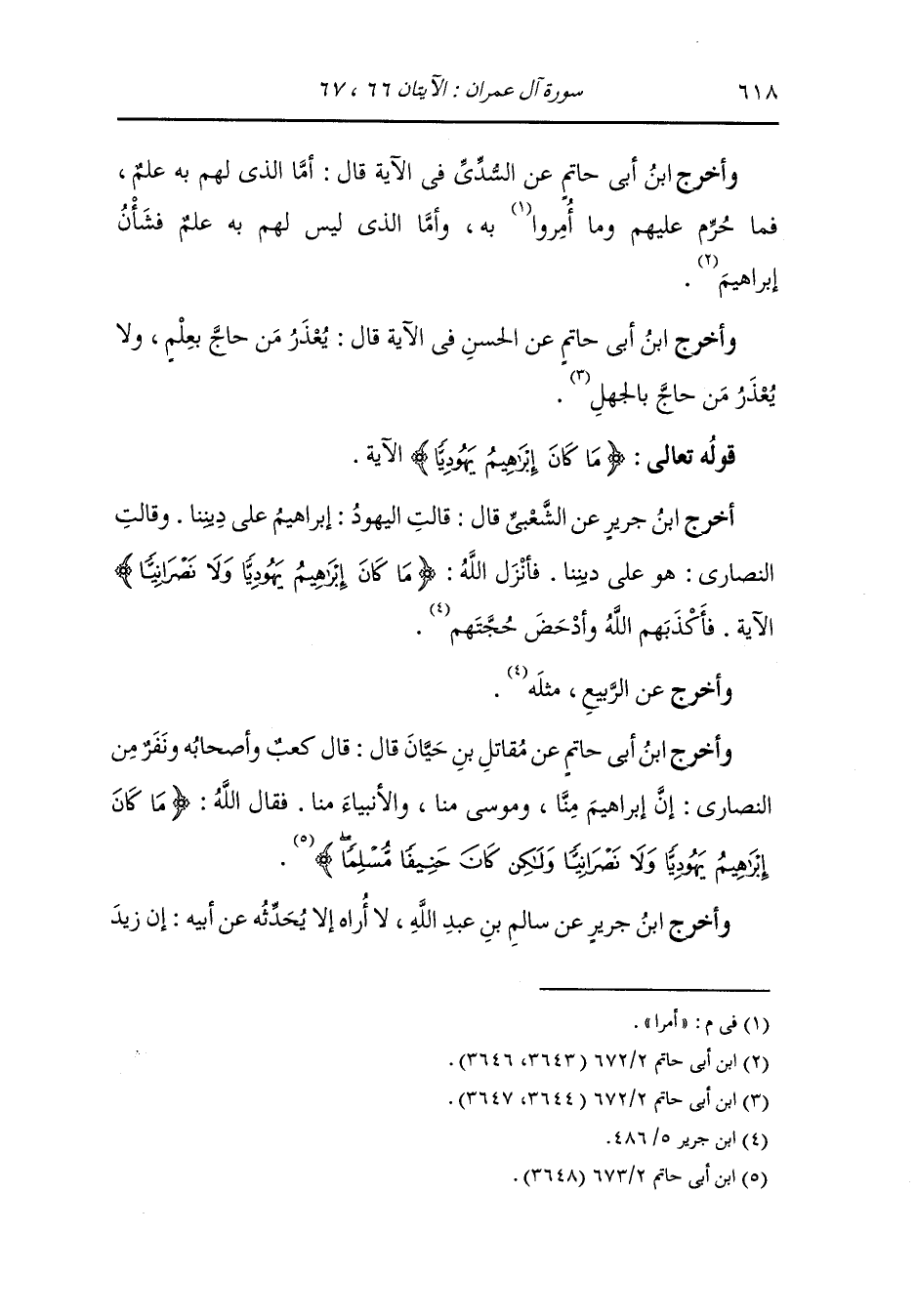 وأخرج ابن أبي حاتم عن مقاتل بن حيان قال : قال كعب وأصحابه ونفر من النصارى : إن إبراهيم منا وموسى منا والأنبياء منا ، فقال الله {ما كان إبراهيم يهوديا ولا نصرانيا ولكن كان حنيفا مسلما}.