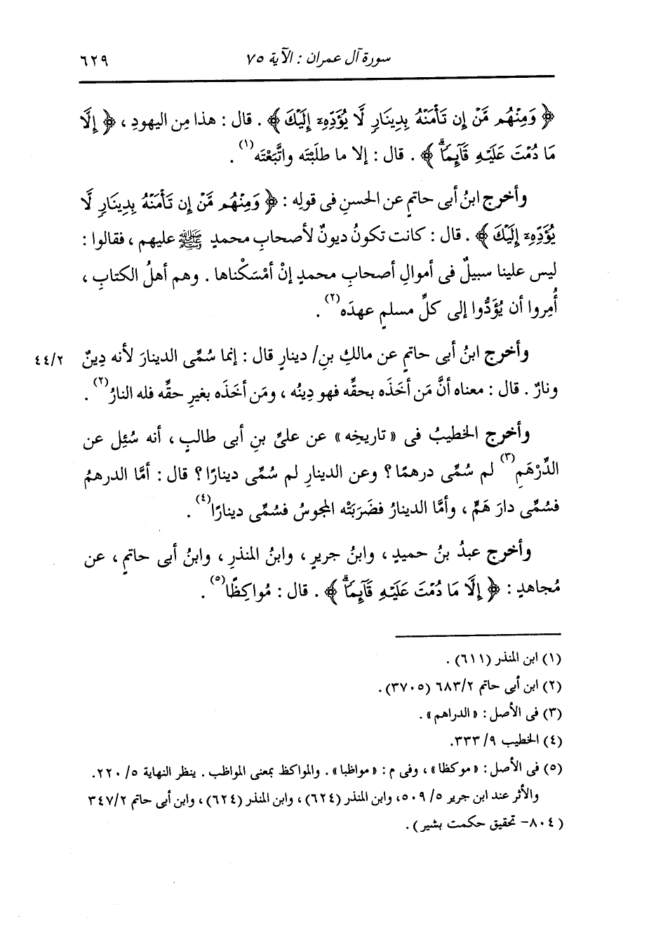 وأخرج ابن أبي حاتم عن الحسن في قوله {ومنهم من إن تأمنه بدينار لا يؤده إليك} قال : كانت تكون ديون لأصحاب محمد عليهم فقالوا : ليس علينا سبيل في أموال أصحاب محمد إن أمسكناها ، وهم أهل الكتاب أمروا أن يؤدوا إلى كل مسلم عهده.
