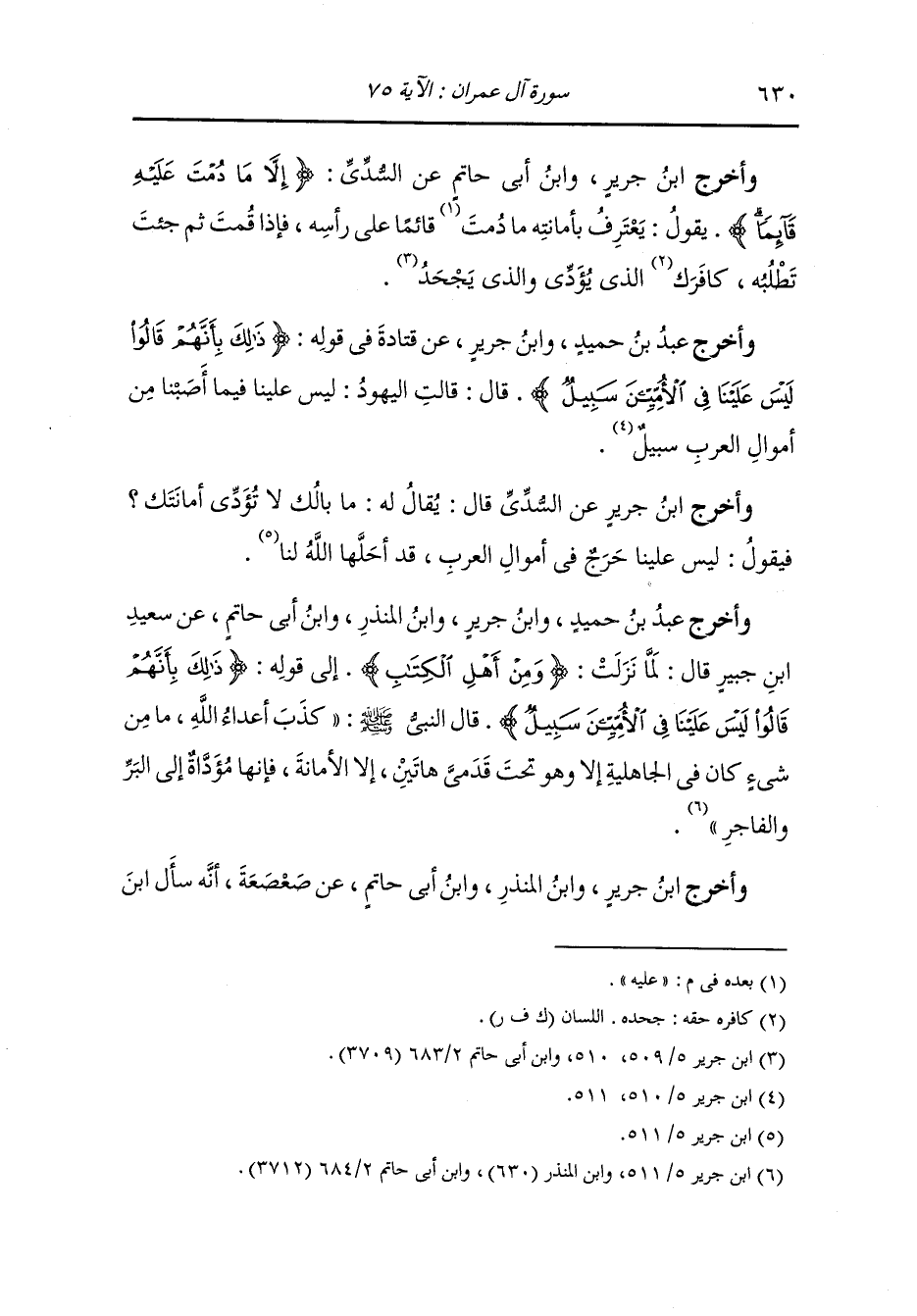 وأخرج عَبد بن حُمَيد ، وَابن جَرِير ، وَابن المنذر ، وَابن أبي حاتم عن سعيد بن جبير قال : لما نزلت {ومن أهل الكتاب} إلى قوله {ذلك بأنهم قالوا ليس علينا في الأميين سبيل} قال النَّبِيّ صلى الله عليه وسلم : كذب أعداء الله ما من شيء كان في الجاهلية إلا وهو تحت قدمي هاتين إلا الأمانة فإنها مؤداة إلى البر والفاجر.