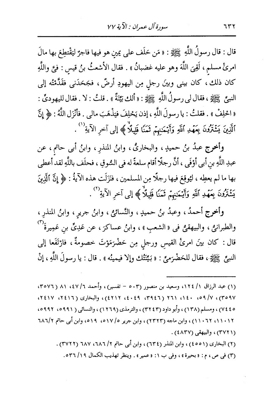 وأخرج عَبد بن حُمَيد والبخاري ، وَابن المنذر ، وَابن أبي حاتم عن عبد الله بن أبي أوفى أن رجلا أقام سلعة له في السوق فحلف بالله لقد أعطي بها ما لم يعطه ليوقع فيها رجلا من المسلمين ، فنزلت هذه الآية {إن الذين يشترون بعهد الله وأيمانهم ثمنا قليلا} إلى آخر الآية ، واخرج أحمد ، وعَبد بن حُمَيد والنسائي ، وَابن جَرِير ، وَابن المنذر والطبراني والبيهقي في الشعب ، وَابن عساكر عن عدي بن بحيرة قال كان بين امرى ء القيس ورجل من حضرموت خصومة فارتفعا إلى النَّبِيّ صلى الله عليه وسلم فقال للحضرمي : بينتك وإلا فيمينه قال : يا رسول الله إن