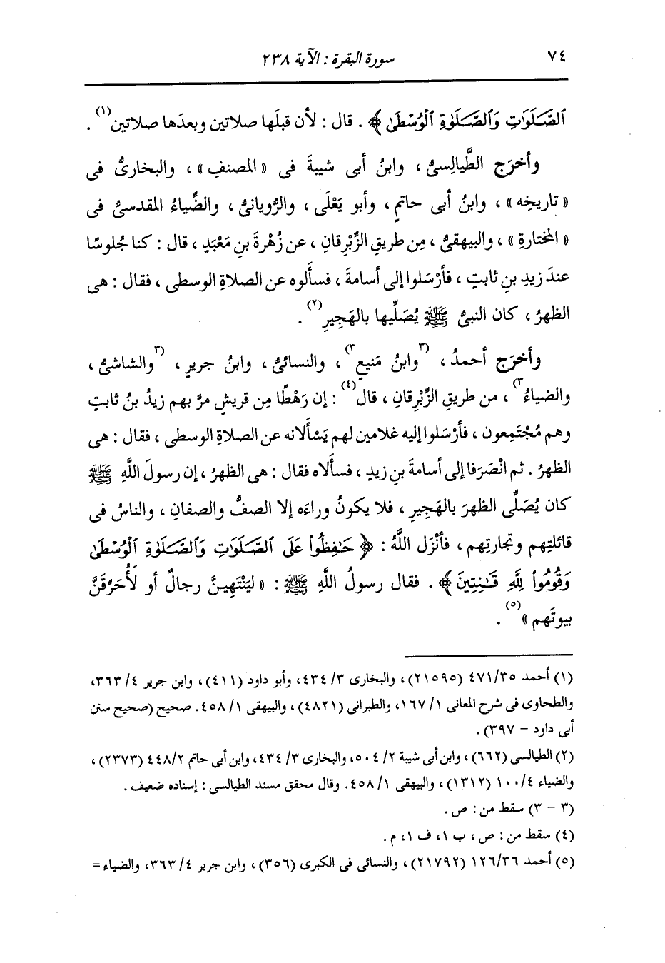 وأخرج أحمد والبخاري في تاريخه وأبو داود والطحاوي والروياني وأبو يعلى والطبراني والبيهقي من طريق الزبرقان عن عروة بن الزبير عن زيد بن ثابت أن النَّبِيّ صلى الله عليه وسلم كان يصلي الظهر بالهاجرة وكانت أثقل الصلاة على أصحابه فنزلت {حافظوا على
