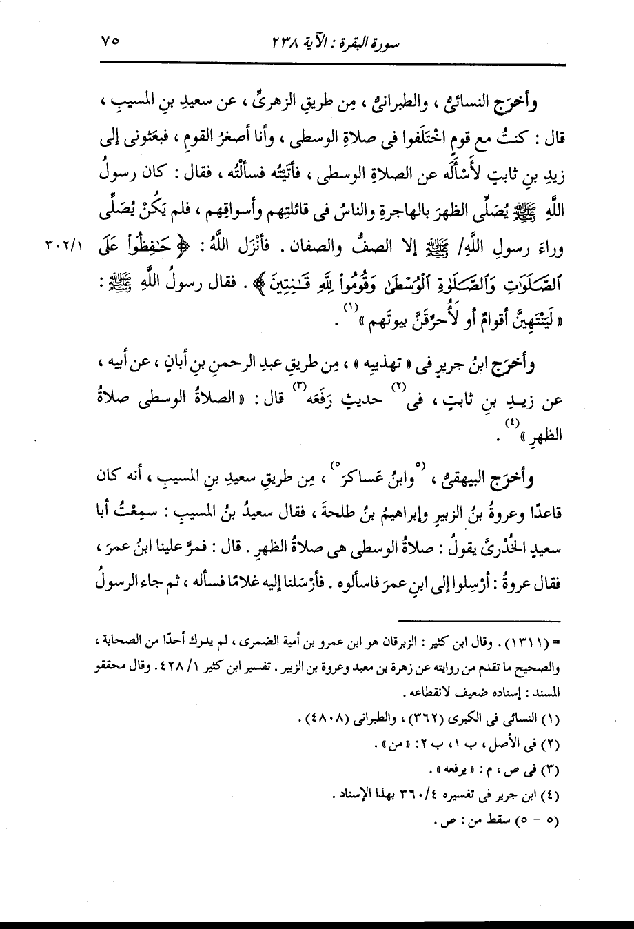 وأخرج أحمد ، وَابن المنيع والنسائي ، وَابن جَرِير والشاشي والضياء من طريق الزبرقان أن رهطا من قريش مر بهم زيد بن ثايت وهم مجتمعون فأرسلوا إليه غلامين لهم يسألانه عن الصلاة الوسطى فقال : الظهر ثم انصرفا إلى أسامة بن زيد فسألاه فقال : هي الظهر إن رسول الله صلى الله عليه وسلم كان يصلي الظهر بالهجير فلا يكون وراءه إلا الصف والصفان والناس في قائلتهم وتجارتهم فأنزل الله {حافظوا على الصلوات والصلاة الوسطى وقوموا لله قانتين} فقال رسول الله صلى الله عليه وسلم : لينتهين رجال أو لأحرقن بيوتهم