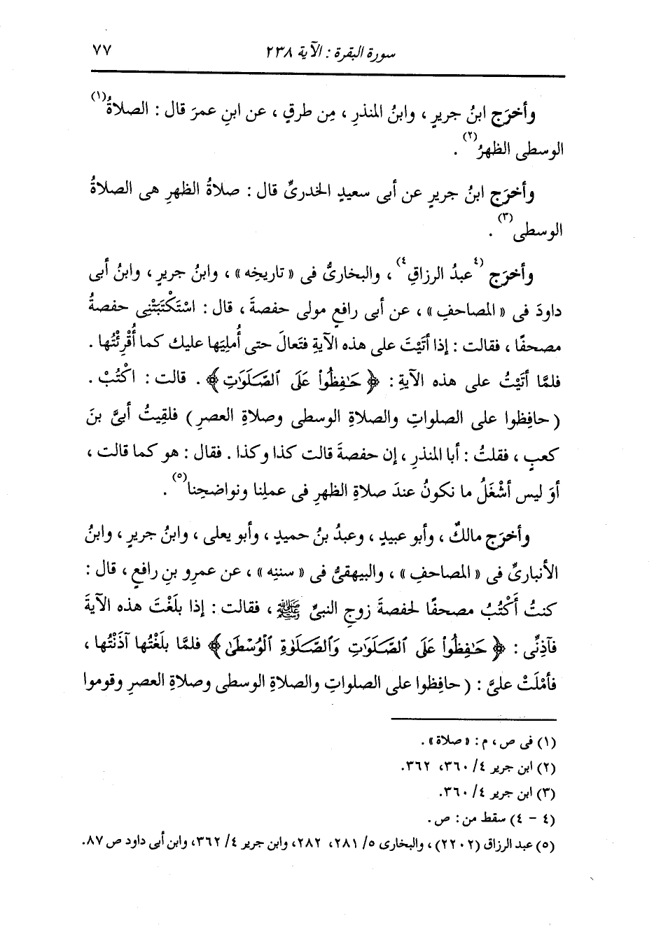 وأخرج عبد الرزاق ، وعَبد بن حُمَيد ، وَابن المنذر عن حرملة مولى زيد بن ثابت قال : تمارى زيد بن ثابت وأبي بن كعب في الصلاة الوسطى فأرسلاني إلى عائشة أي صلاة هي فقالت : الظهر ، فكان زيد يقول : هي الظهر فلا أدري عنه أخذه أو عن غيرها.