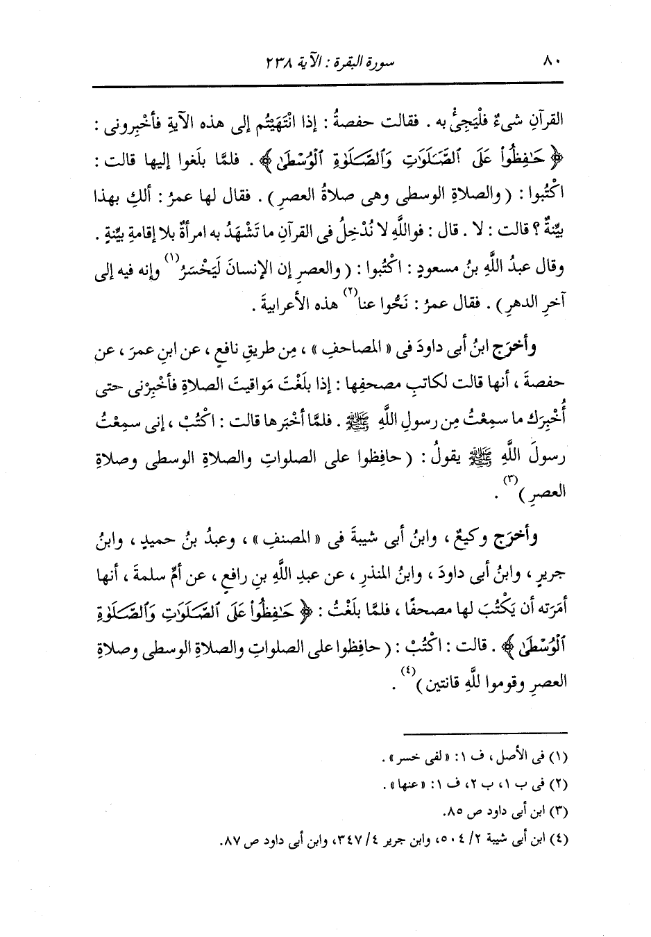 وأخرج عبد الرزاق ، وَابن أبي داود عن هشام بن عروة قال : قرأت في مصحف عائشة (حافظوا على الصلوات والصلاة الوسطى وصلاة العصر وقوموا لله قانتين).