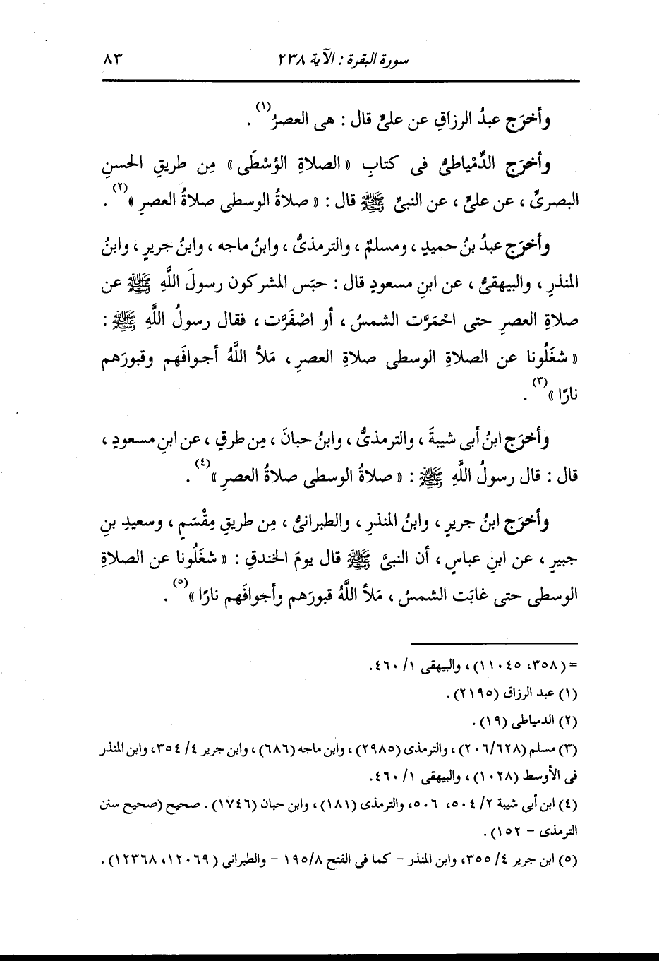 وأخرج عبد الرزاق ، وَابن أبي شيبة ، وعَبد بن حُمَيد ومسلم والنسائي والبيهقي عن شتير بن شكل قال : سألت عليا عن الصلاة الوسطى فقال : كنا نرى انها الصبح حتى سمعت النَّبِيّ صلى الله عليه وسلم يقول يوم الأحزاب ملأ الله بيوتهم وقبورهم نارا كما شغلونا عن الصلاة الوسطى حتى غابت الشمس ولم يكن صلى يومئذ الظهر والعصر حتى غابت الشمس