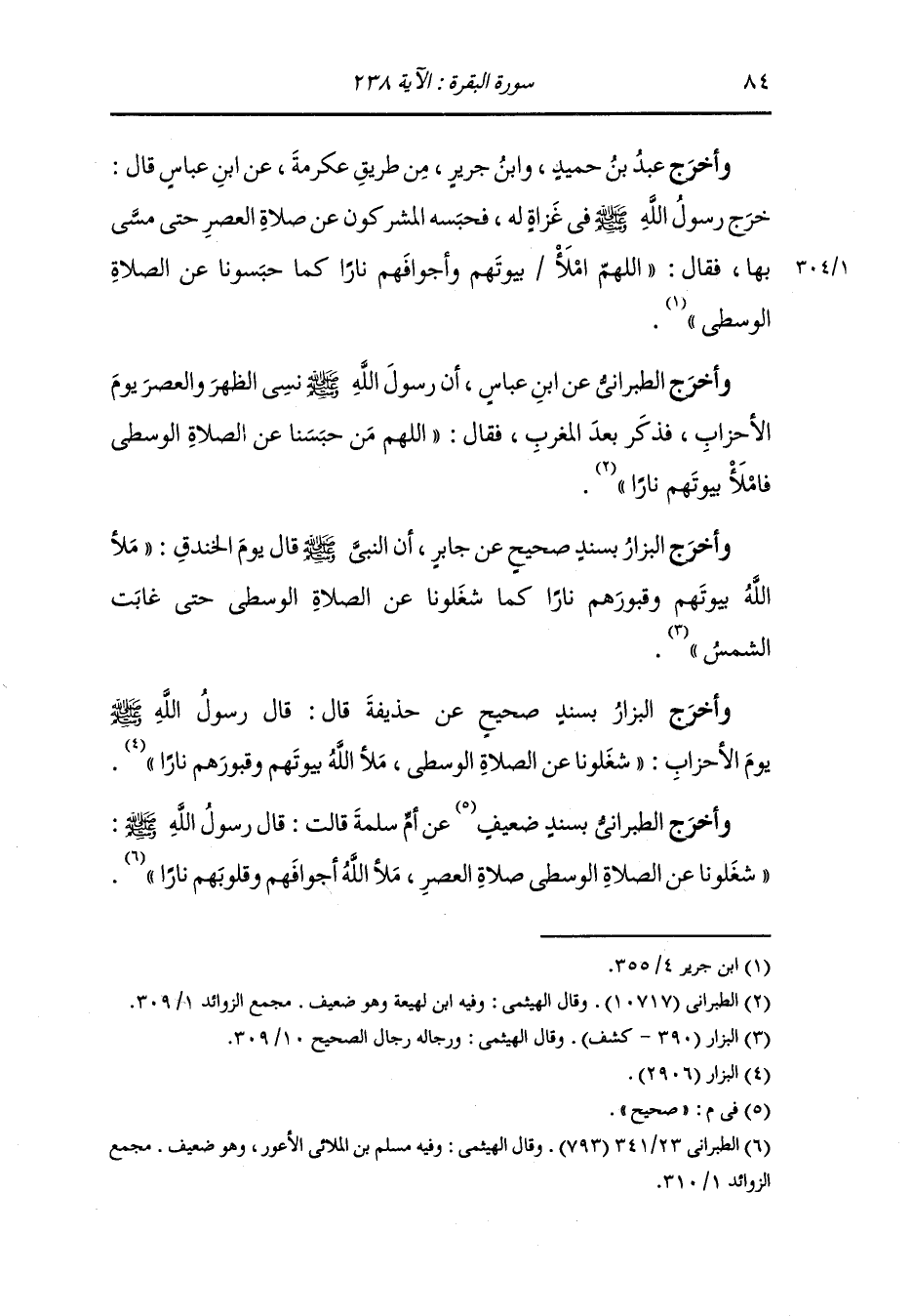 وأخرج عَبد بن حُمَيد ومسلم والترمذي ، وَابن ماجة ، وَابن جَرِير ، وَابن المنذر والبيهقي عن ابن مسعود قال حبس المشركون رسول الله صلى الله عليه وسلم عن صلاة العصر حتى احمرت الشمس أو اصفرت فقال رسول الله صلى الله عليه وسلم : شغلونا عن الصلاة الوسطى صلاة العصر ملأ الله أجوافهم وقبورهم نارا.