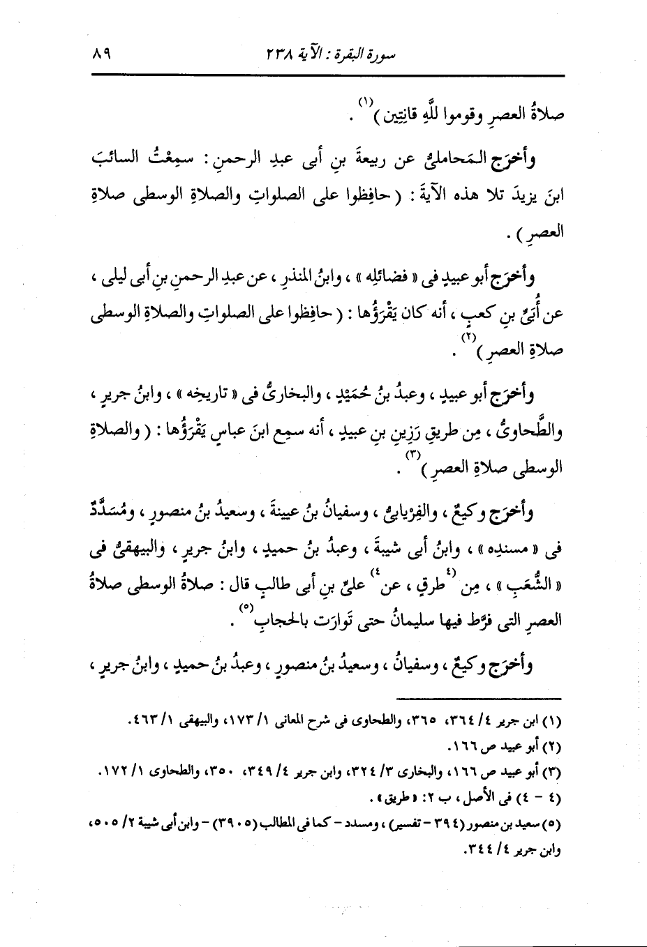 وأخرج ابن أبي داود عن قبيصة بن ذؤيب قال في مصحف عائشة (حافظوا على الصلوات والصلاة الوسطى والصلاة الوسطى صلاة العصر).
