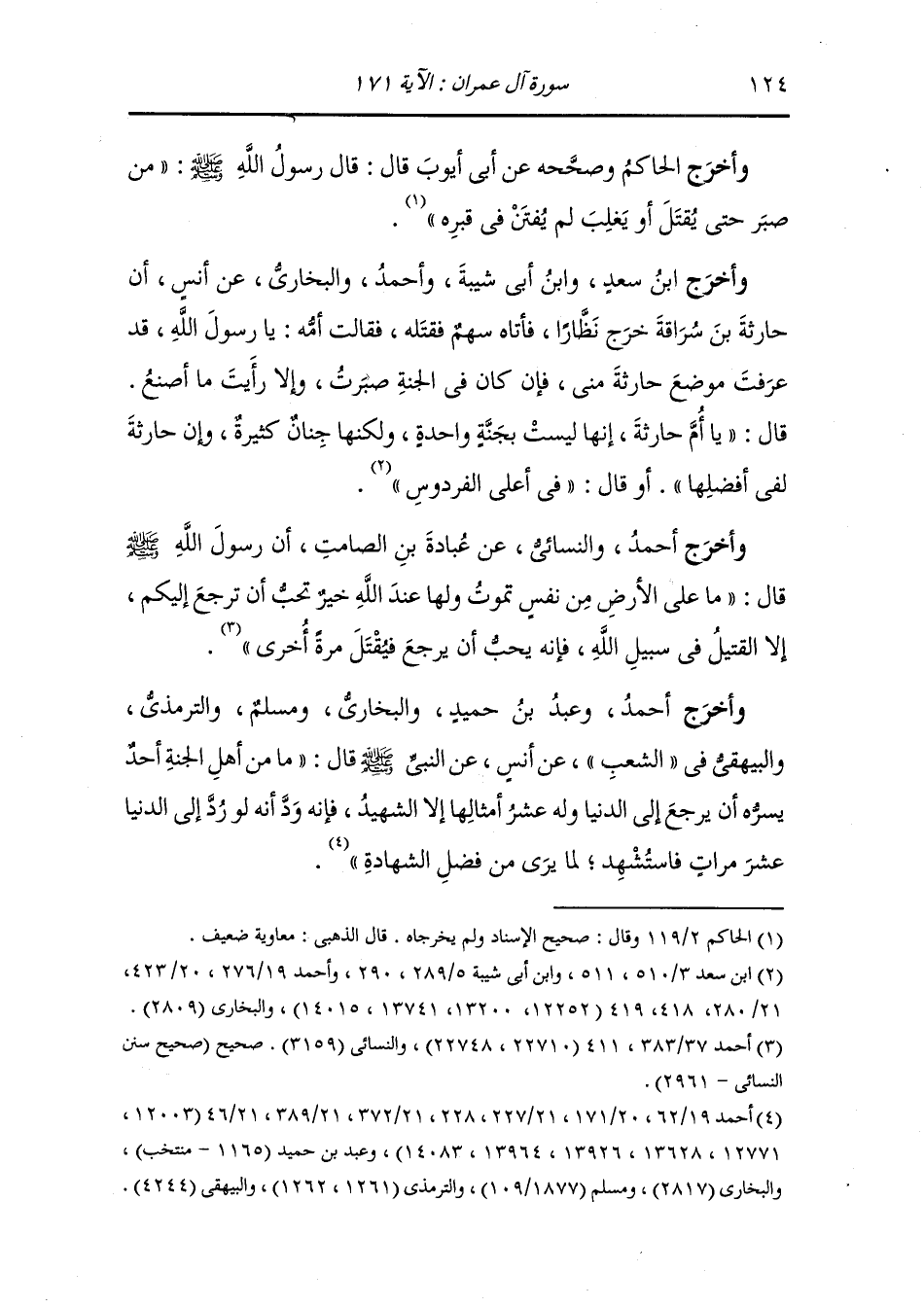 وأخرج أحمد ومسلم والنسائي والحاكم عن أنس قال : قال رسول الله صلى الله عليه وسلم : يؤتى بالرجل من أهل الجنة فيقول الله له : يا ابن آدم كيف وجدت منزلك فيقول : أي رب خير منزل فيقول : سل وتمن فيقول : أسألك أن تردني إلى الدنيا فأقتل في سبيلك عشر مرات لما رأى من فضل الشهادة ، قال : ويؤتى بالرجل من أهل النار فيقول الله : يا ابن آدم كيف وجدت منزلك فيقول : أي رب شر منزل فيقول : فتفتدي منه بطلاع الأرض ذهبا فيقول : نعم ، فيقول : كذبت قد سألتك دون ذلك فلم تفعل.