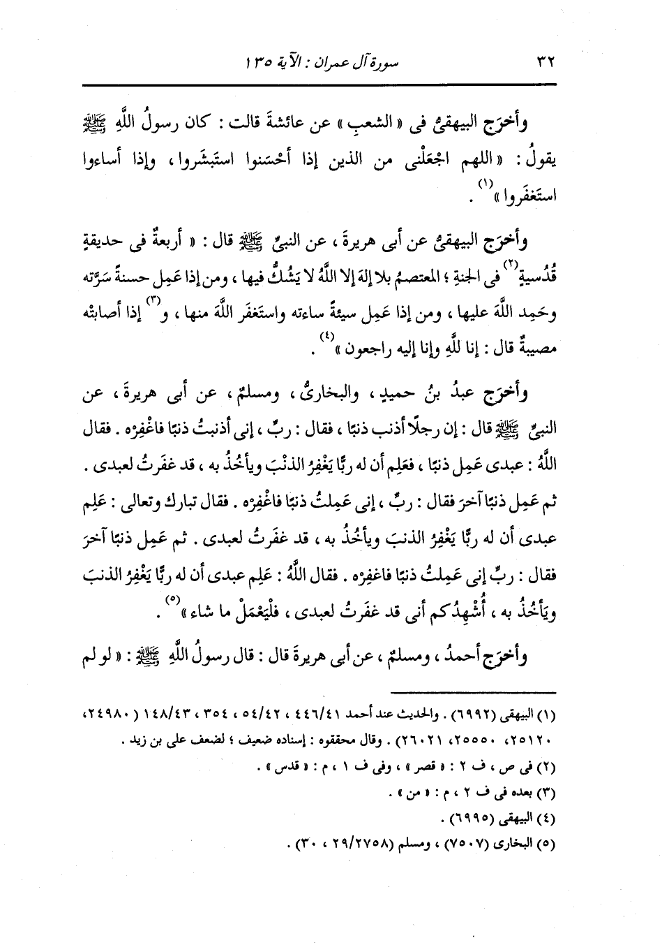 وابن ماجة ، وَابن حبان والدار قطني والبزار ، وَابن جَرِير ، وَابن المنذر ، وَابن أبي حاتم والبيهقي في الشعب عن أبي بكر الصديق : سمعت رسول الله صلى الله عليه وسلم يقول : ما من رجل يذنب ذنبا ثم يقوم فيذكر ذنبه فيتطهر ثم يصلي ركعتين ثم يستغفر الله من ذنبه ذلك إلا غفر الله له ، ثم قرأ هذه الآية {والذين إذا فعلوا فاحشة أو ظلموا أنفسهم ذكروا الله} إلى آخر الآية.