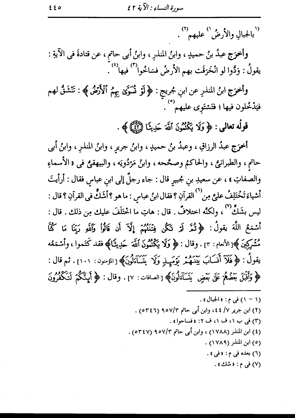 أخرج ابن جرير ، وَابن أبي حاتم من طريق العوفي عن ابن عباس في قوله {لو تسوى بهم الأرض} يعني أن تستوي الأرض