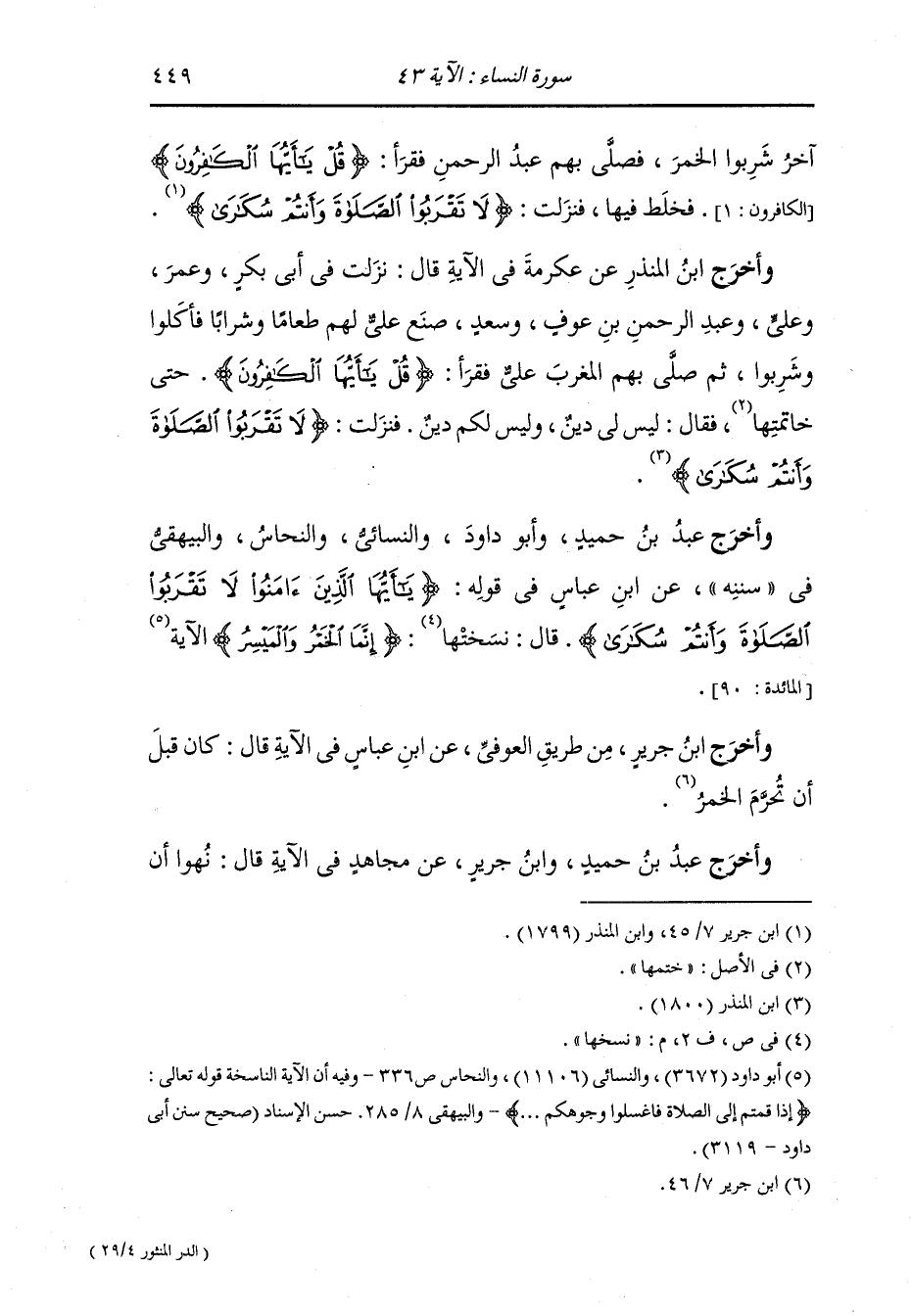 أخرج عَبد بن حُمَيد وأبو داود والترمذي وحسنه والنسائي ، وَابن جَرِير ، وَابن المنذر ، وَابن أبي حاتم والنحاس والحاكم وصححه عن علي بن أبي طالب قال : صنع لنا عبد الرحمن بن عوف طعاما فدعانا وسقانا من الخمر فأخذت الخمر منا وحضرت الصلاة فقدموني فقرأت : قل يا أيها الكافرون لا أعبد ما تعبدون ونحن نعبد ما تعبدون فأنزل الله {يا أيها الذين آمنوا لا تقربوا الصلاة وأنتم سكارى حتى تعلموا ما تقولون}.