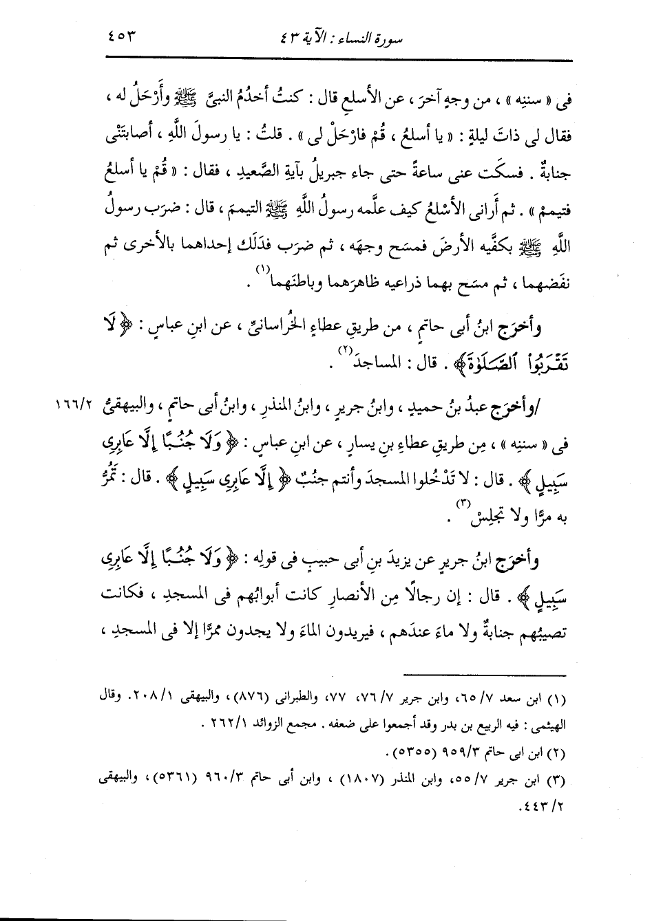 وأخرج الحسن بن سفيان في مسنده والقاضي إسماعيل في الأحكام والطحاوي في مشكل الآثار والباوردي في الصحابة والدارقطني والطبراني وأبو نعيم في المعرفة ، وَابن مردويه والبيهقي في "سُنَنِه" والضياء المقدسي في المختارة عن الأسلع بن شريك قال : كنت أرحل ناقة النَّبِيّ صلى الله عليه وسلم فأصابتني جنابة في ليلة باردة وأراد رسول الله صلى الله عليه وسلم الرحلة فكرهت أن أرحل ناقته وأنا جنب وخشيت أن أغتسل بالماء البارد فأموت أو أمرض فأمرت رجلا من الأنصار فرحلها ثم رضفت أحجارا فأسخنت بها ماء فاغتسلت به ، فأنزل الله {يا أيها الذين آمنوا لا تقربوا الصلاة وأنتم سكارى حتى تعلموا ما تقولون ولا جنبا إلا عابري سبيل} إلى {إن الله كان عفوا غفورا}.