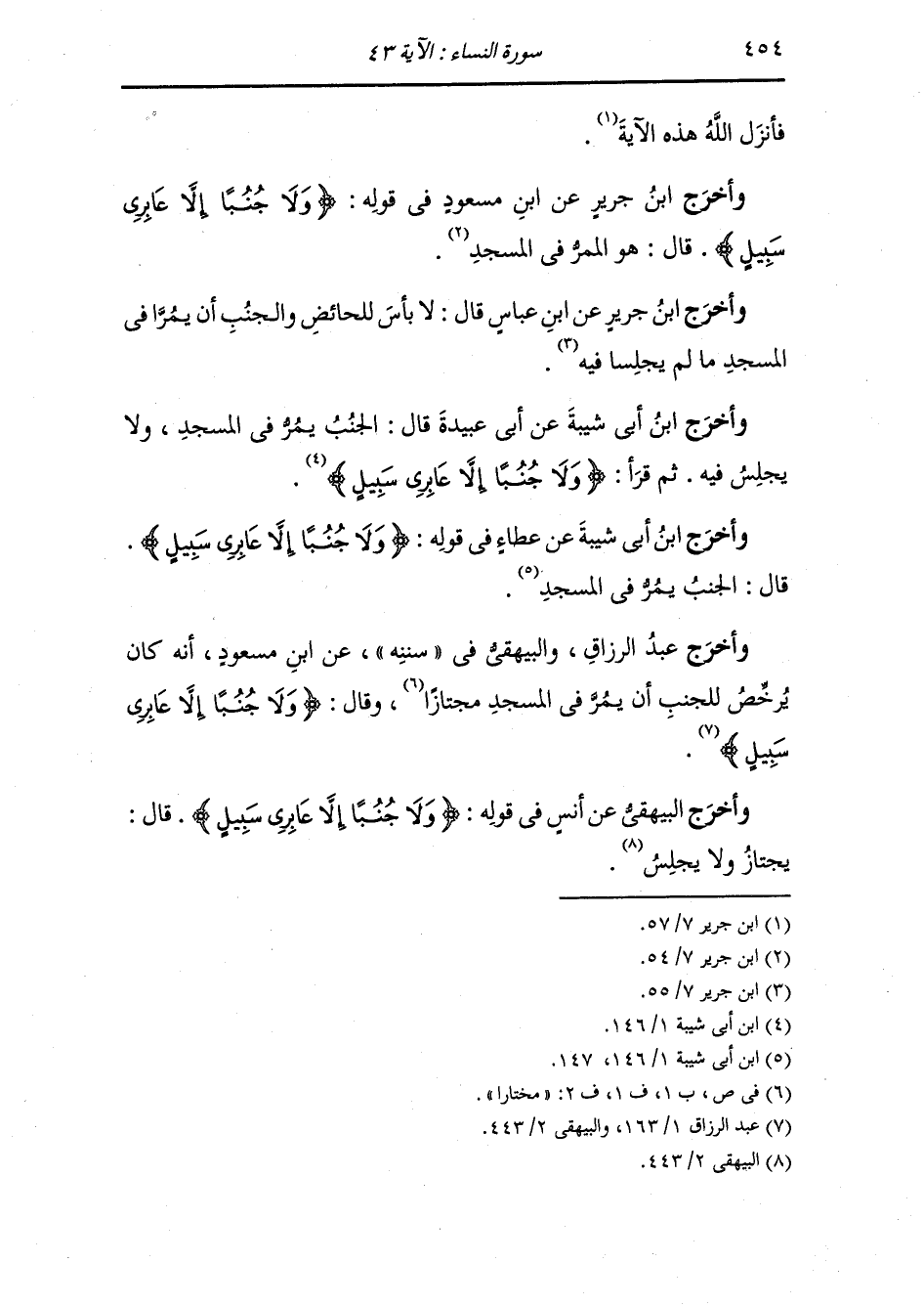 وأخرج عَبد بن حُمَيد ، وَابن جَرِير ، وَابن المنذر ، وَابن أبي حاتم والبيهقي في "سُنَنِه" من طريق عطاء بن يسار عن ابن عباس {ولا جنبا إلا عابري سبيل} قال : لا تدخلوا المسجد وأنتم جنب إلا عابري سبيل ، قال : تمر به مرا ولا تجلس.