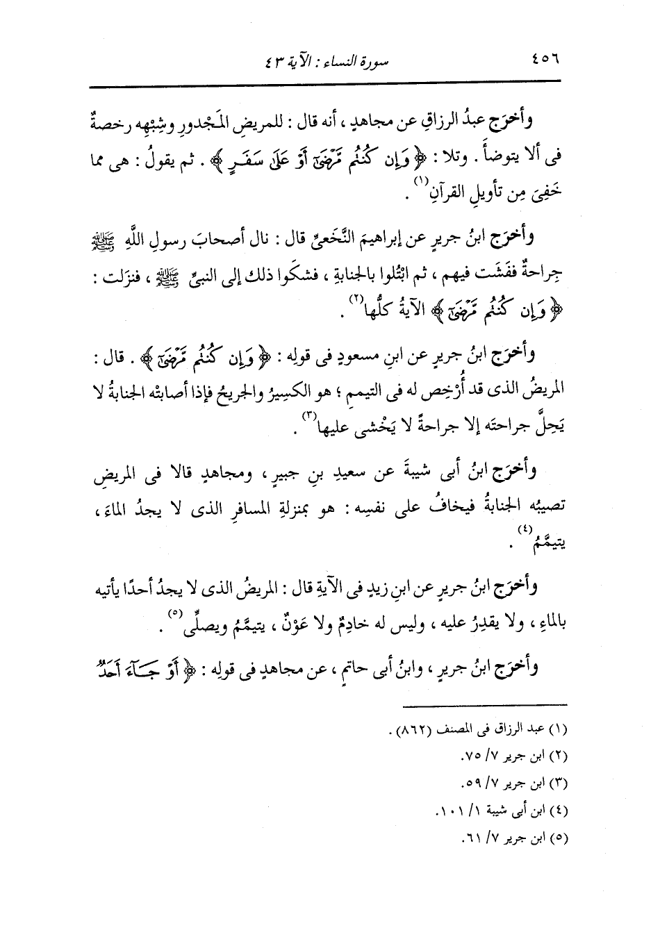 وأخرج ابن أبي شيبة ، وعَبد بن حُمَيد ، وَابن المنذر ، وَابن أبي حاتم والبيهقي عن ابن عباس في قوله {وإن كنتم مرضى} قال : هو الرجل المجدور أو به الجراح أو القرح يجنب فيخاف إن اغتسل أن يموت فيتيمم.