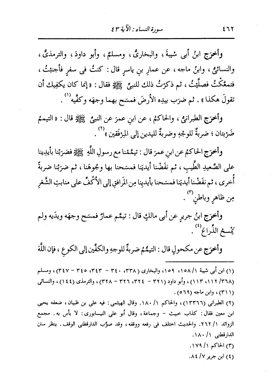 وأخرج الطبراني والحاكم عن ابن عمر عن النَّبِيّ صلى الله عليه وسلم قال : التيمم ضربتان : ضربة للوجه وضربة لليدين إلى المرفقين.