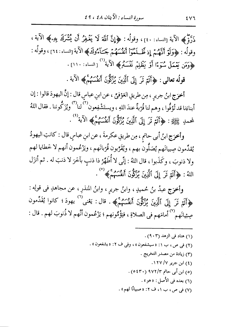 وأخرج ابن جرير عن أبي مالك في قوله {ألم تر إلى الذين يزكون أنفسهم} قال : نزلت في اليهود كانوا يقدمون صبيانهم يقولون : ليست لهم ذنوب.